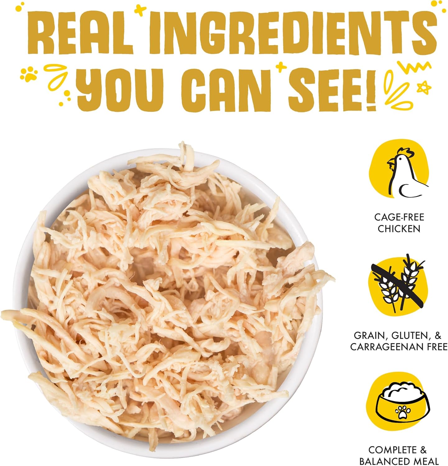 - Paw Lickin’ Chicken (10oz cans, pack of 12) Featuring thinly shredded, cage-free boneless, skinless white-meat chicken in a delicious gravy. Our most popular flavor!