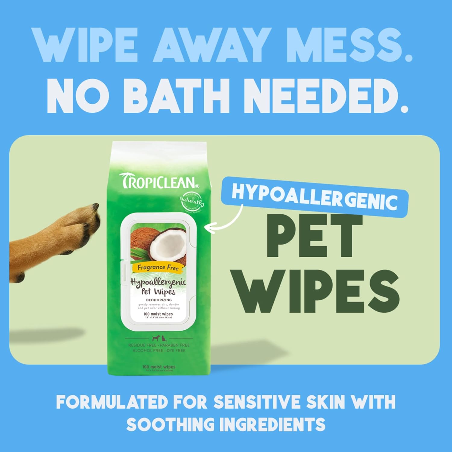 - On-the-go wipes - Fragrance-free TropiClean hypoallergenic pet wipes provide a quick and easy clean-up for the face, paws, body and bottom.