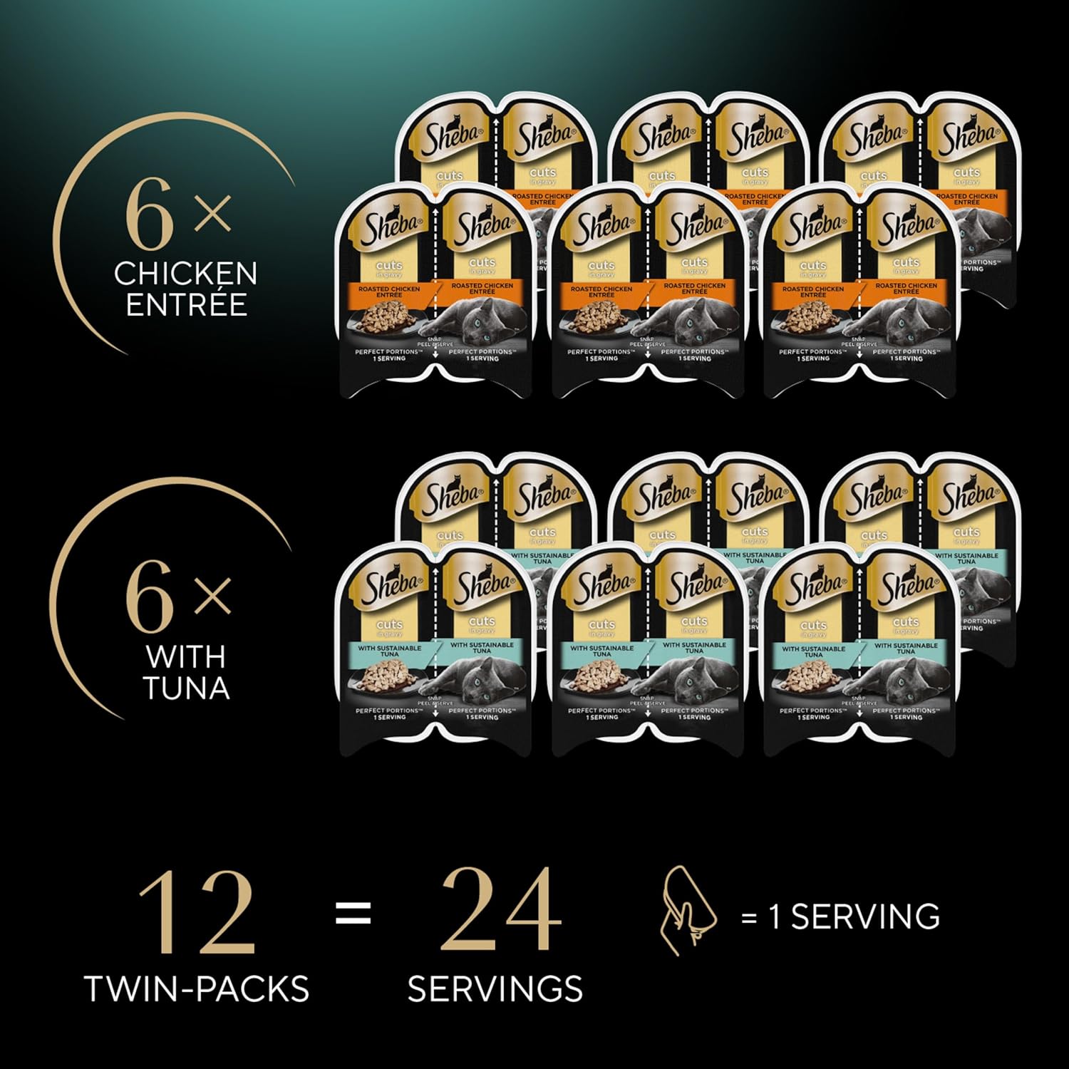 Sheba Perfect Portions Wet Cat Food Cuts in Gravy Variety Pack, Roasted Chicken Entree and with Sustainable Tuna, 2.6 oz. Twin-Pack Trays (12 Count, 24 Servings)
