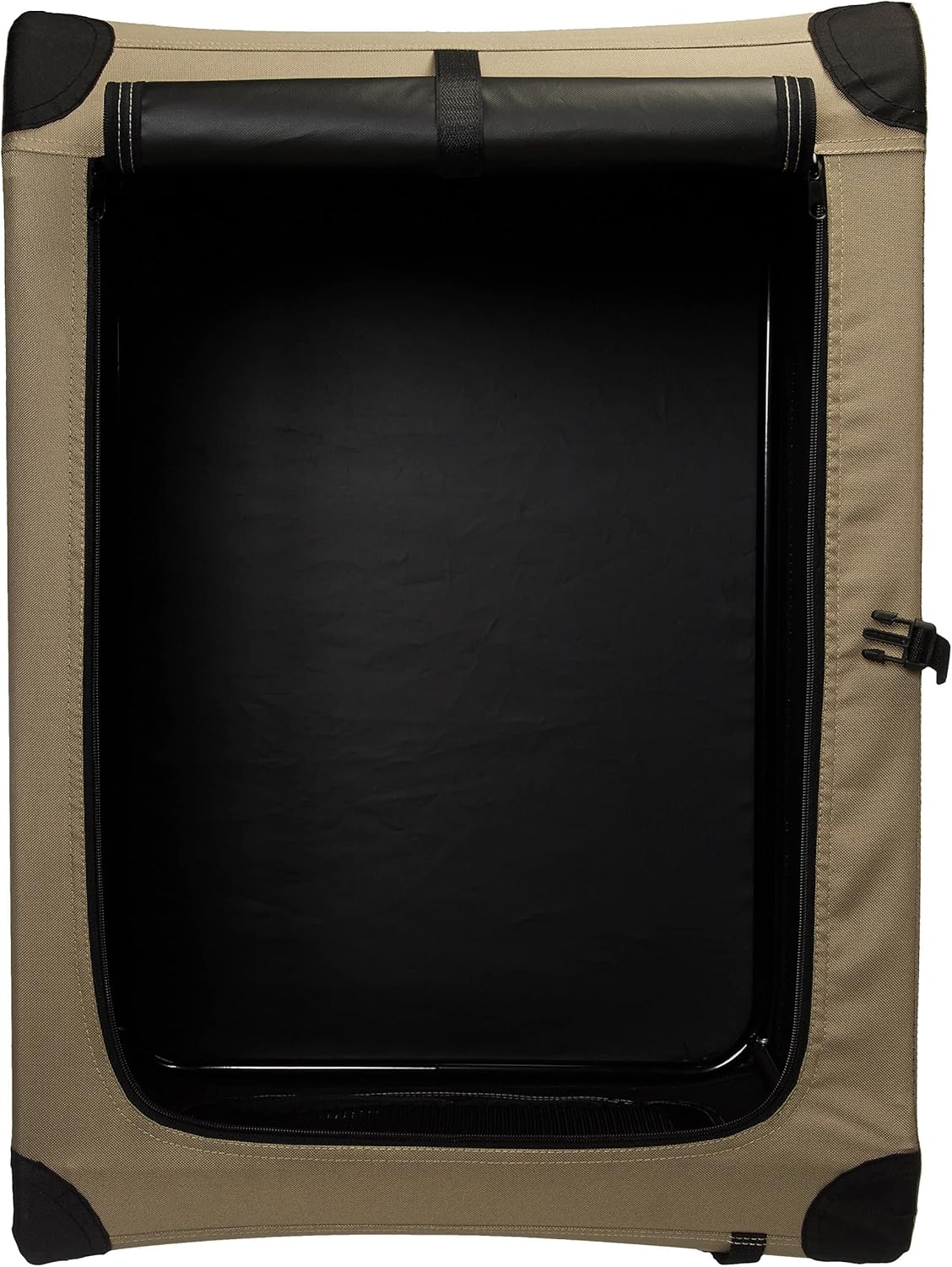 - Soft-sided dog crate for keeping a furry 4-legged friend safe and comfortable when traveling, includes a Small dog crate made of tan polyester fabric and a lightweight yet sturdy frame