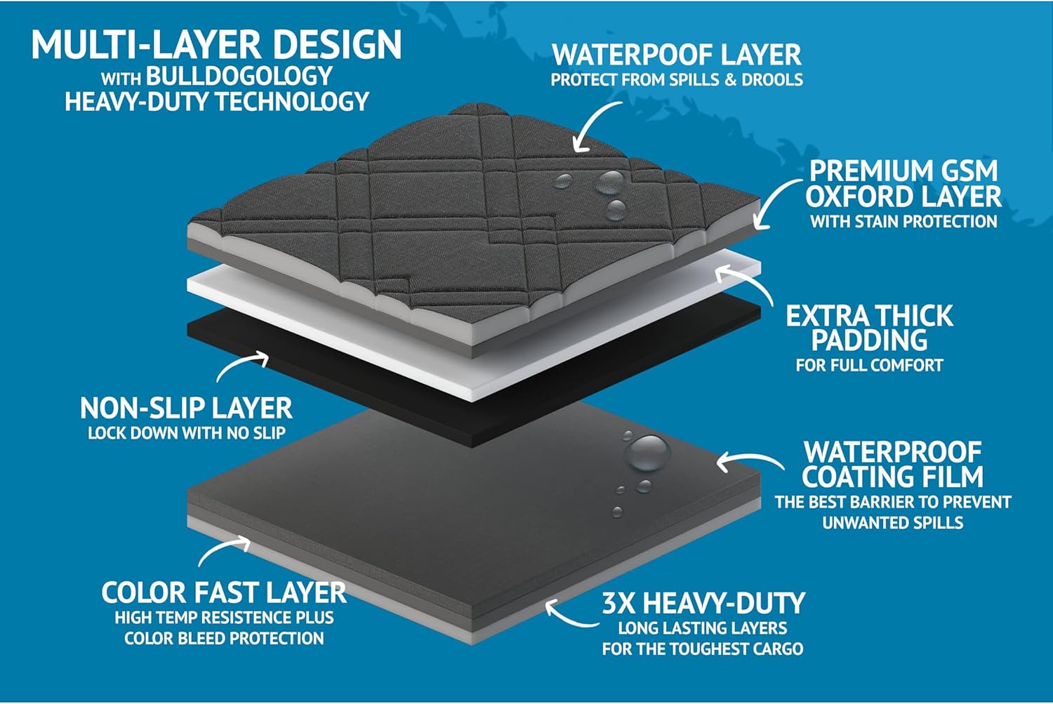 - Premium Quality: Bulldogology designed premium pet cargo seat covers that's modern and easily matches your vehicle interior. Each cargo cover is incredibly strong and padded with thick materials that’s made for long-term use. It is the ultra-protection cover while providing a more comfortable ride for you and your pets. Infused with Color-Fast layers preventing color bleeding, Free of AZO dyes, and can withstand extreme temperatures without damaging your vehicle.