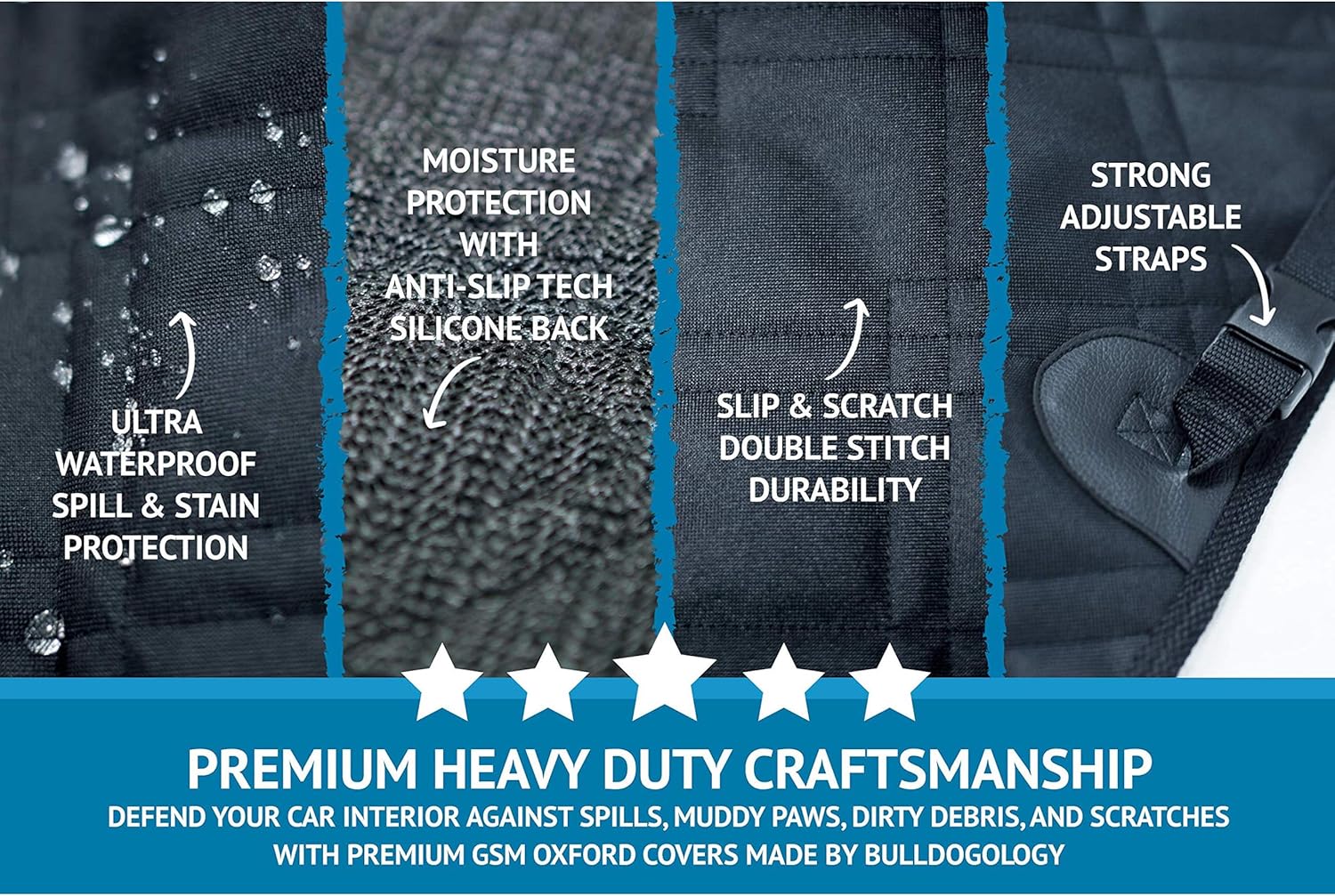 - Heavy Duty Protector: Defend your cargo and trunk area against dog hair, muddy paws, dirty debris, scratches, spills, stains, scratches, groceries, heavy equipment, beach sand, fur and other unwanted accidents. Bulldogology Dog proof Pet cargo covers includes side flaps and extra thick layers for all-around protection. Regardless of what your pet may put it through, our dog car seat covers are crafted with 2x stitched quilted premium 600D GSM Oxford Material that Guarantees Lifetime Satisfaction