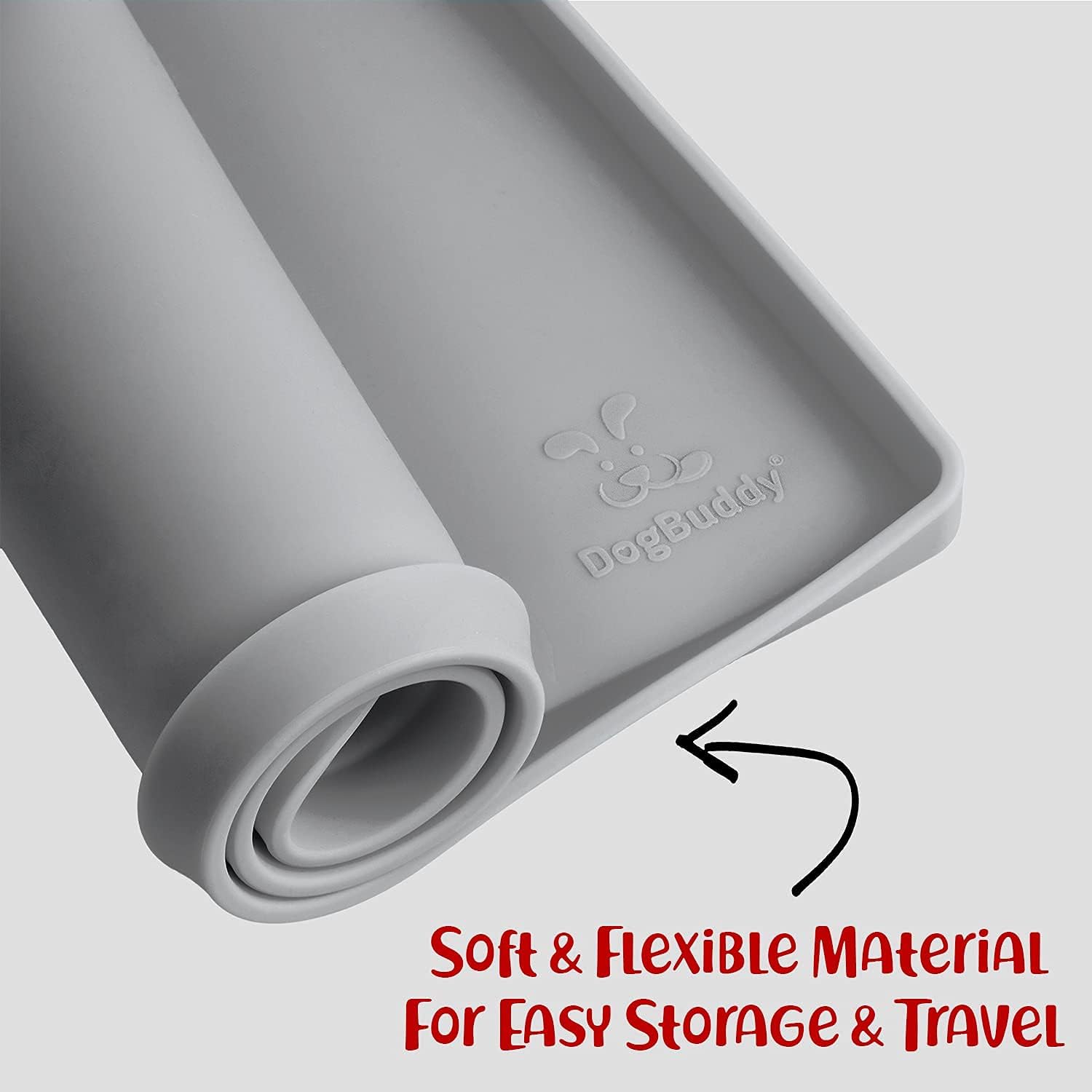 - Less Mess & Less Stress: Super high edge (0.6”) of DogBuddy Dog Food Mat keeps the spilled food and water on the mat and away from your beautiful floor. Silicone is naturally 100% waterproof, so what happens on the mat stays on the mat.
