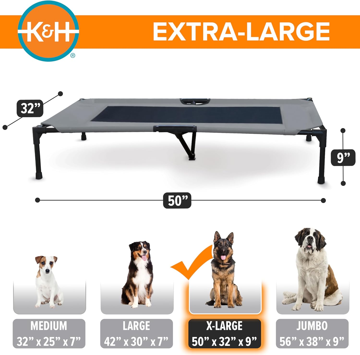 K&H Pet Products Outdoor Elevated Dog Cot, Breathable Cooling Elevated Cot Hammock Pet Bed for XL Dogs, Washable Mesh Cover, Raised Metal Frame, Collapsible, Portable - Extra-Large 50 X 32in Gray