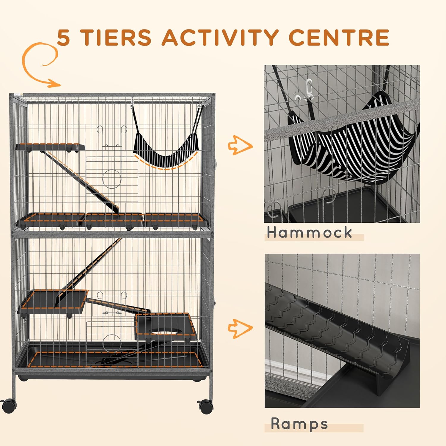 PawHut 50" 5-Tier Small Animal Cage, Ferret Cage, Large Chinchilla Cage with Hammock Accessory & Heavy-Duty Steel Wire, Small Animal Habitat with 4 Doors, Removable Tray, Gray