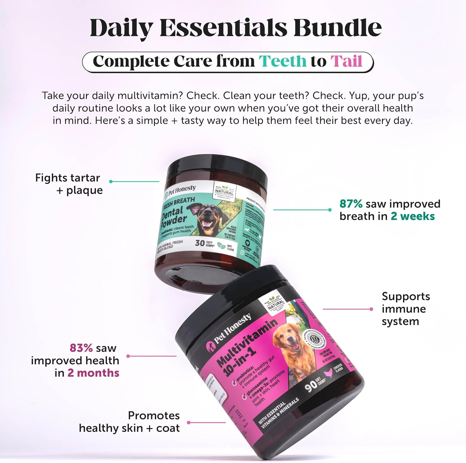 - Pet Honesty Pledge: A taste your pet will love & results you can trust. Made with the most effective natural + other premium ingredients. Formulated without corn, wheat, or soy. No artificial preservatives, colors, or flavors.
