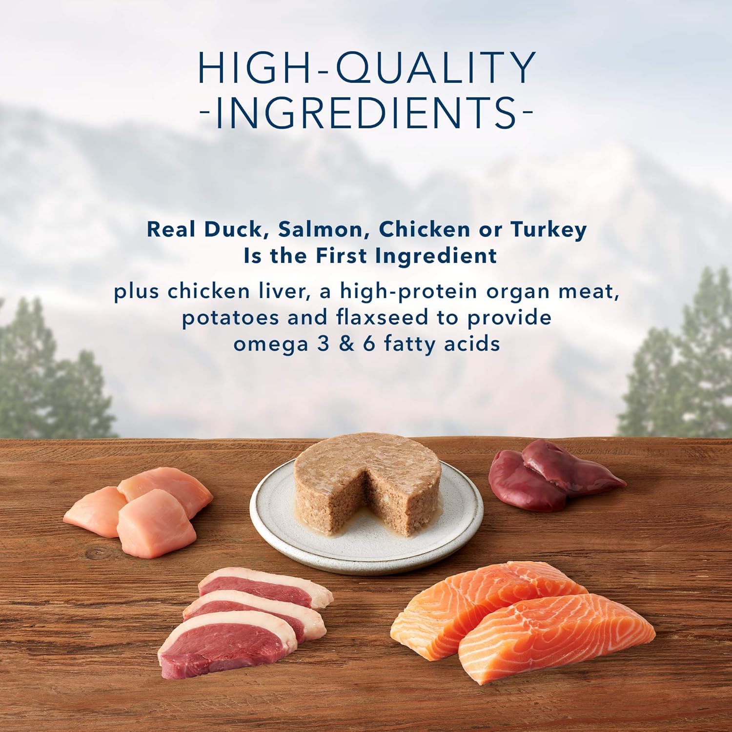 - Contains One (1) Variety Pack of BLUE Wilderness High Protein Grain Free, Natural Adult Pate Wet Cat Food, Chicken, Salmon, Duck, Turkey 3-oz (24 count- 6 of each flavor)
