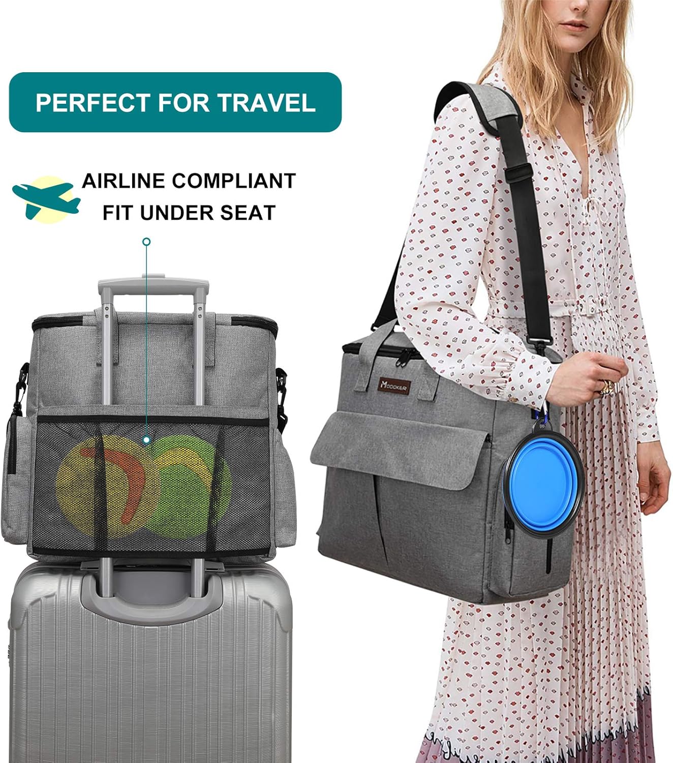 Modoker Dog Travel Bag, Weekend Pet Travel Set for Dog and Cat, Airline Approved Tote Organizer with Multi-Function Pockets, 2 Food Storage Containers, 2 Collapsible Bowls, 1 Feeding Mat (Grey)