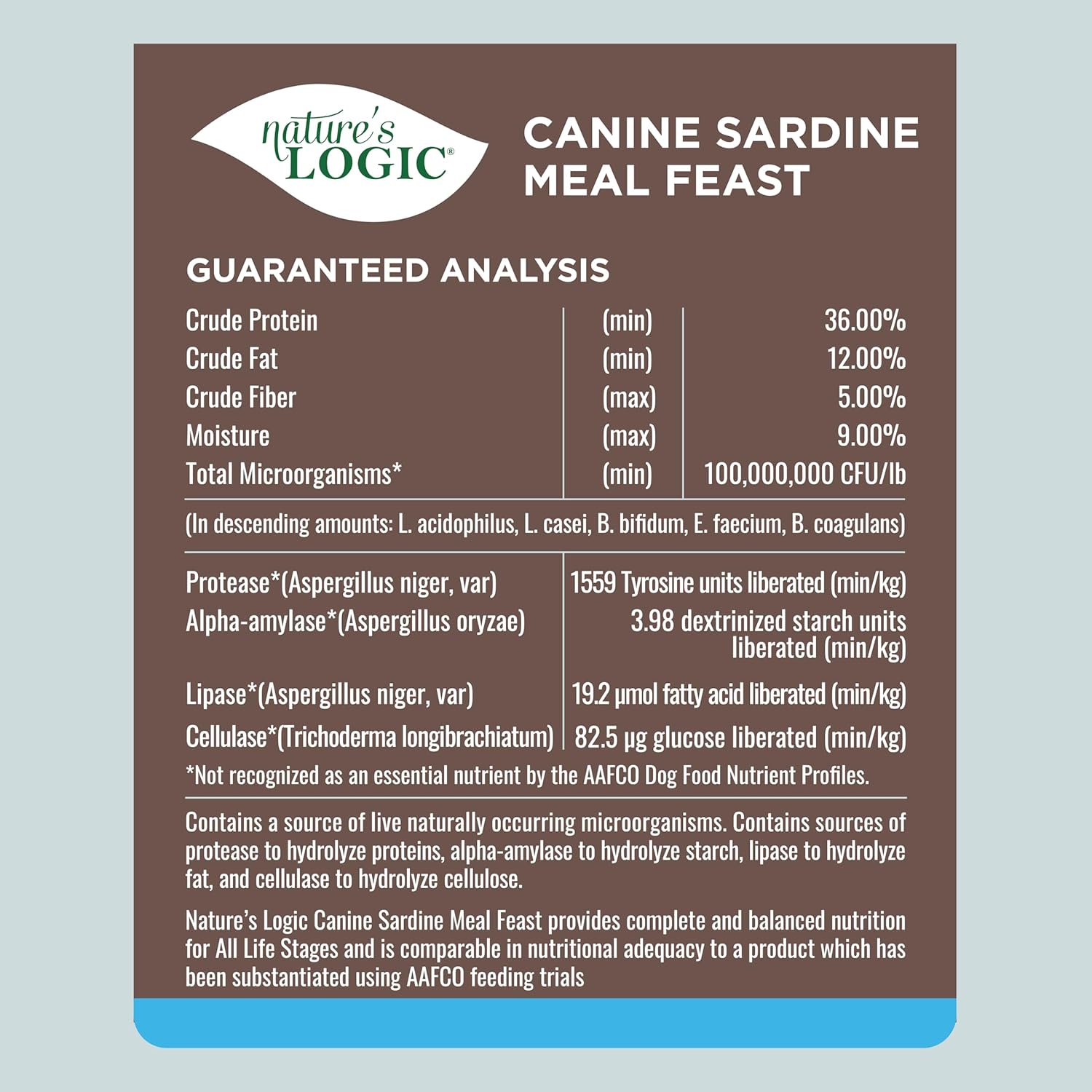 - HIGH PROTEIN FOR STRONG MUSCLES: Nature’s Logic Canine Sardine Meal Feast provides 86% of its protein from high-quality meat sources, with turkey meal as the main ingredient. This ensures your furry friend builds strong muscles, perfect for keeping them active and healthy throughout their life.