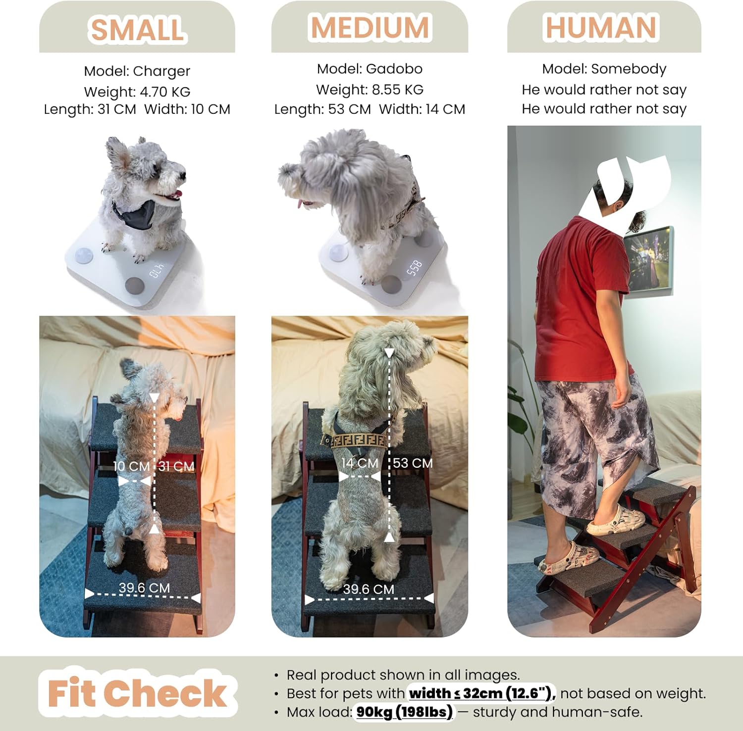 - 5. Size & Weight Capacity Step:15.6" L x 9.3" W x 5.9" H in 3-step full open: 24.8" L x 17.2" W x 19.5" H in. Folded: 31" L x 17.2" W x 3.15" H in Max load: 100kg / 220lbs. Designed for small and medium dogs and cats with waist width ≤32cm / 12.6in.