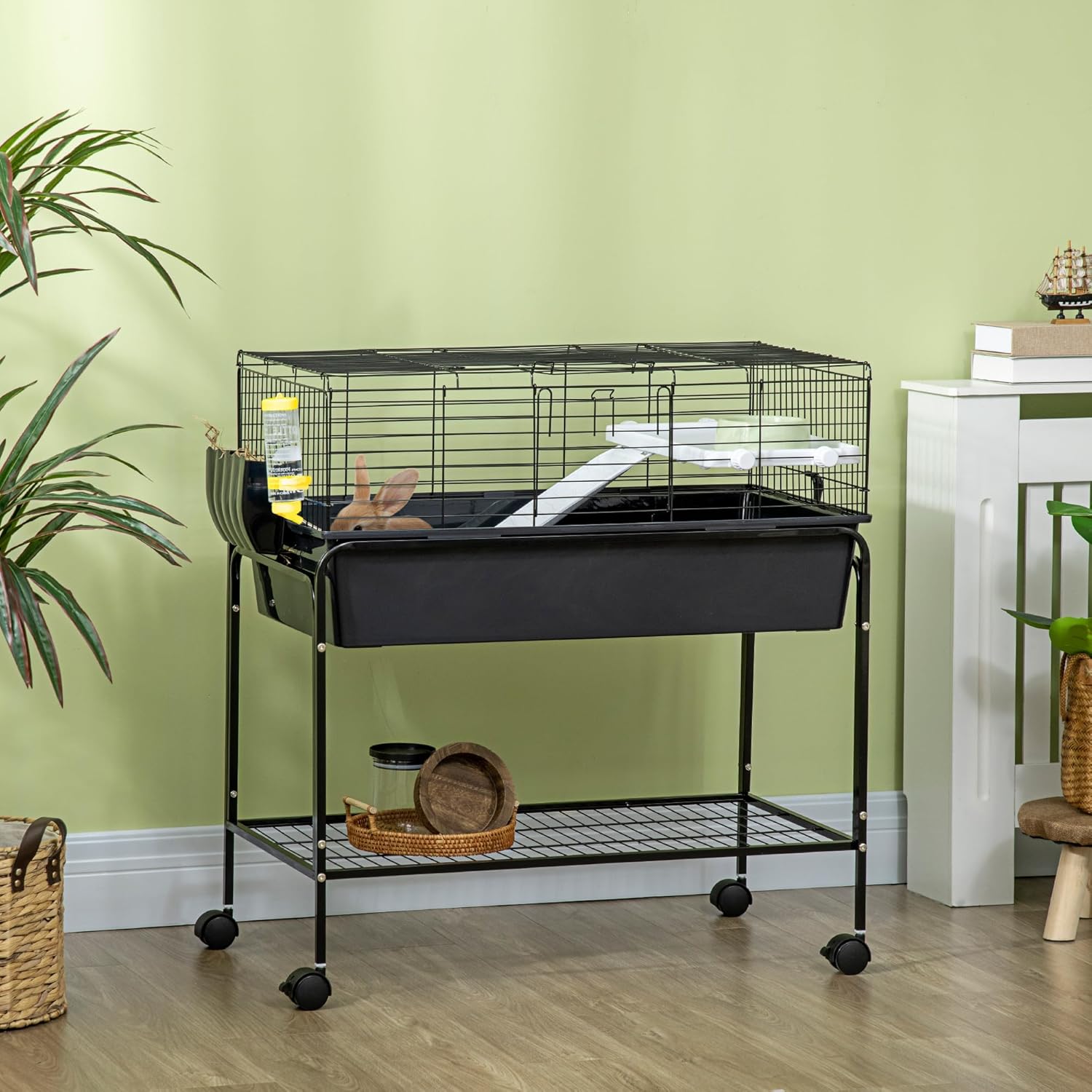 PawHut Two-Story Small Animal Cage Removable from Stand, Guinea Pig Cage with Shelf & Wheels, Pet Habitat for Hedgehog, Chinchilla, Ferret, 33" x 18.5" x 35", Black
