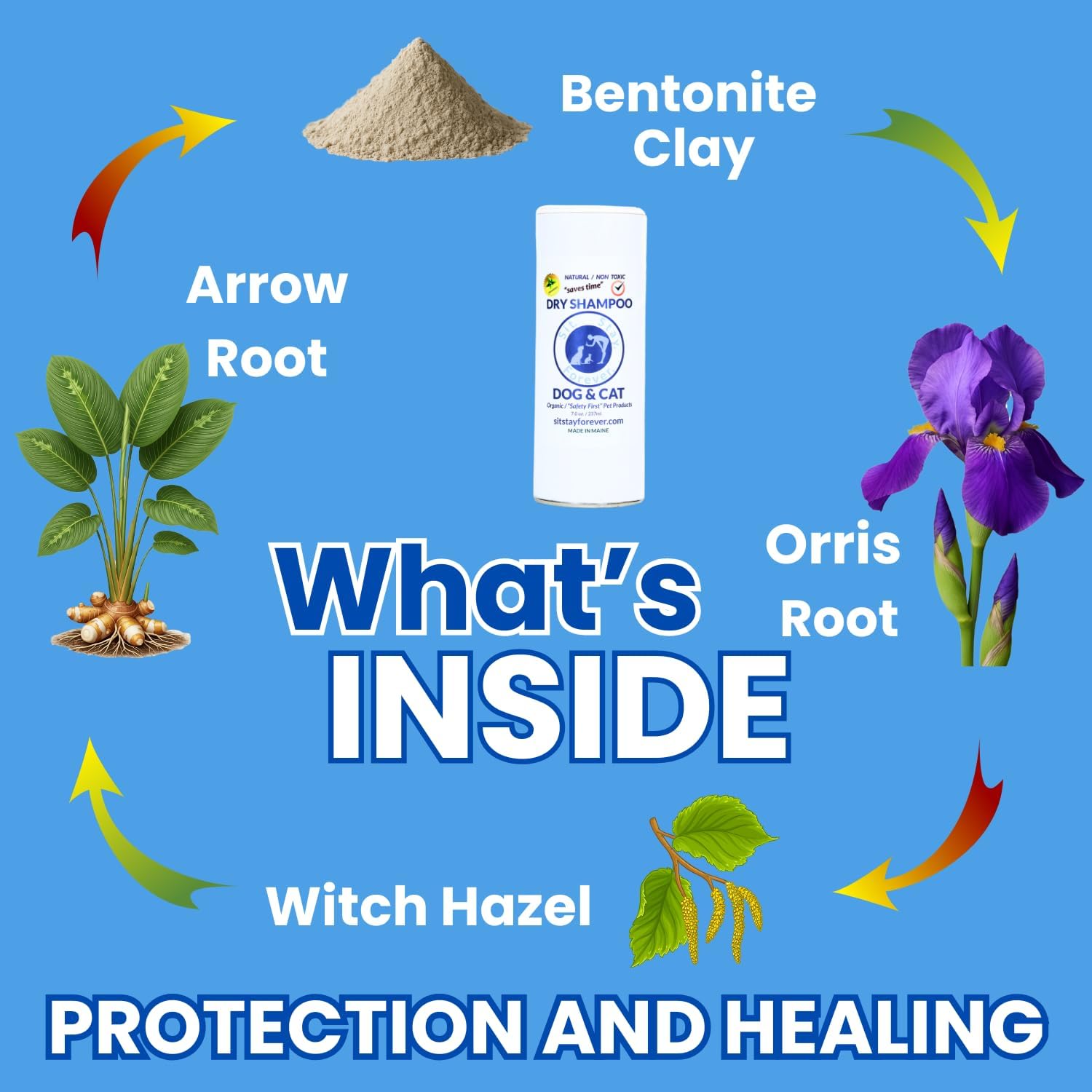 - Safe for All Dogs: Trust in our dry shampoo for your dog's sensitive skin issues; Crafted from organic natural ingredients, Hypoallergenic and gentle yet effective for all breeds; ensures your pet enjoys a clean and fresh coat without irritation. Great for cats too; Non-toxic ingredients; Crafted without synthetic additives or harsh chemicals. Your go to odor eliminator for everyday pet managment, saving you time and money. Shake and brush; Dont worry about making a mess on the floor our dry shampoo makes a great carpet and bedding refresher too.