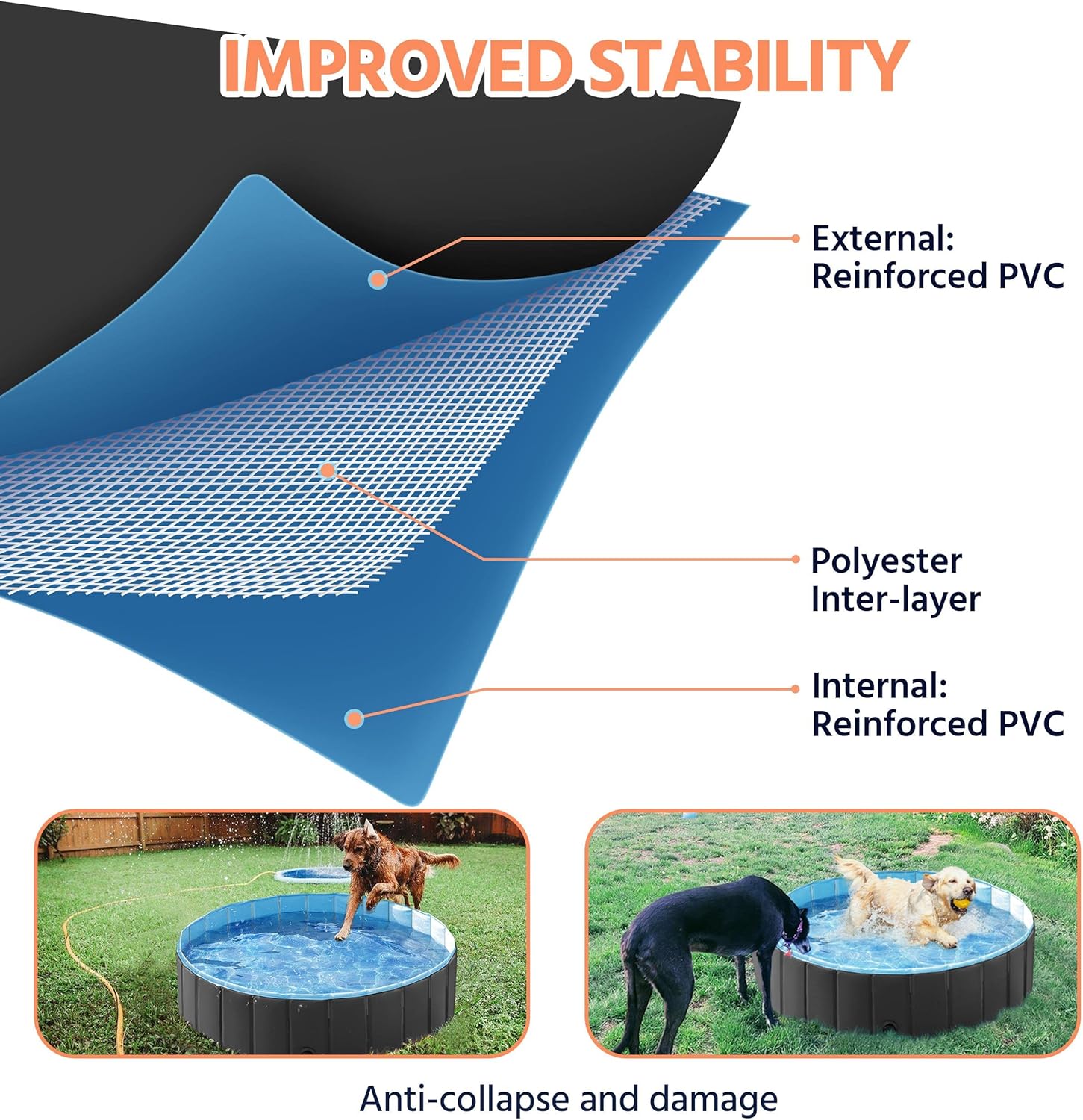 - Premium Materials: The pet pool is made of waterproof PVC and polyester mesh in the interlayer, and the interior material is made of durable PP boards. The quality materials are strong and durable, and wear-resistant for long-time use
