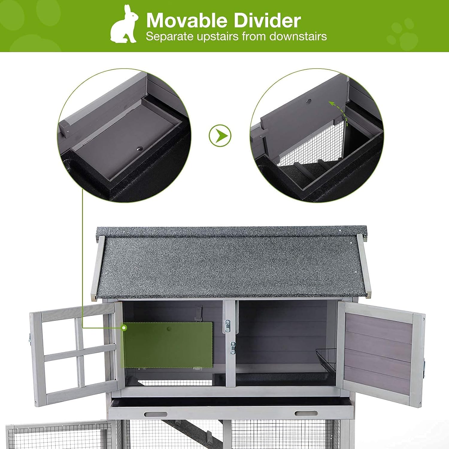 - 【100% Non-TOXIC 】100% Non-TOXIC Solid Fir wood, asphalt roof suitable for indoor and outdoor use, free rabbit chewing toy & metal feeder include.Overall Size: L38.6" x D25.6" x H44.2"