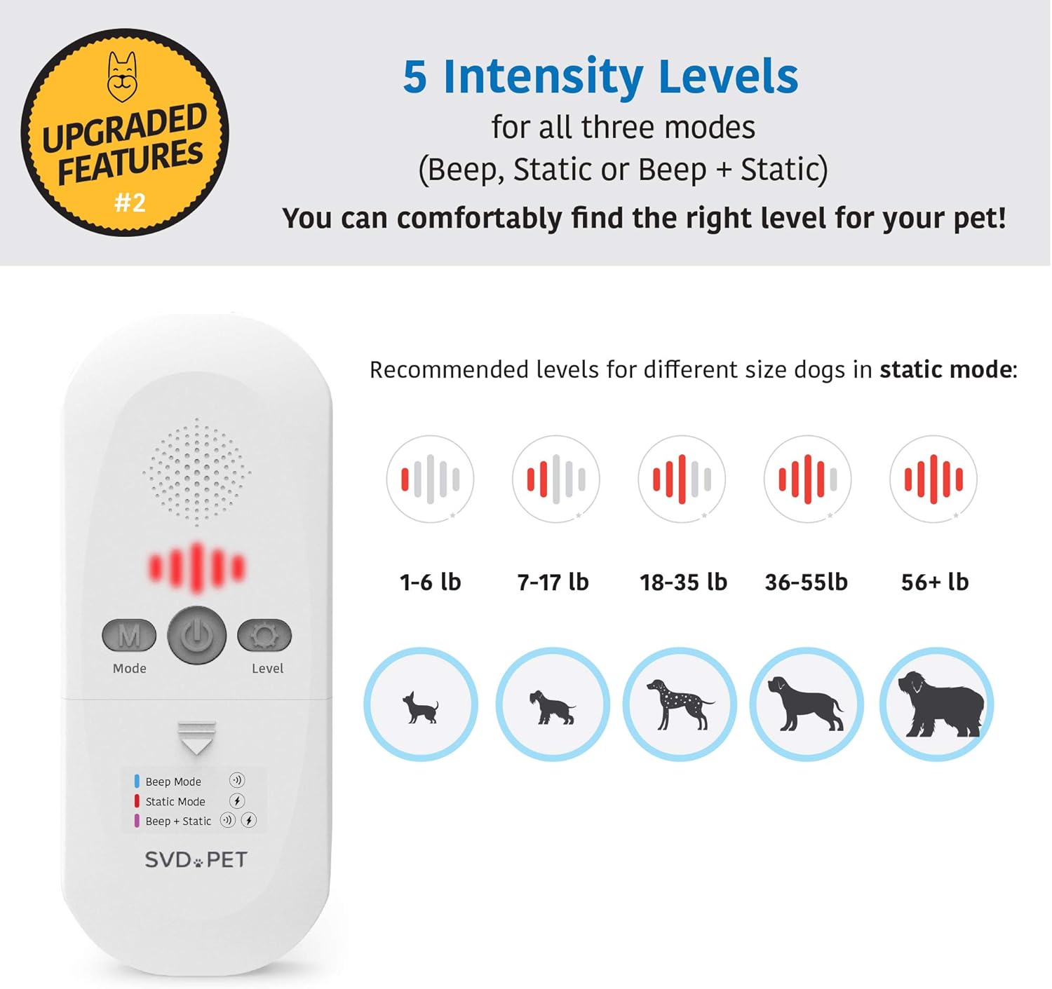 - 3 Training Modes – Choose from Static mode, Beep mode, or Static + Beep mode. All modes feature 5 levels of intensity for you to train from small to large cat or dog comfortably. Can be used to prevent couch and door scratching from dogs and cats; create a pet barrier for home; keep your pets off bed and counter; keep animals off your vehicle.
