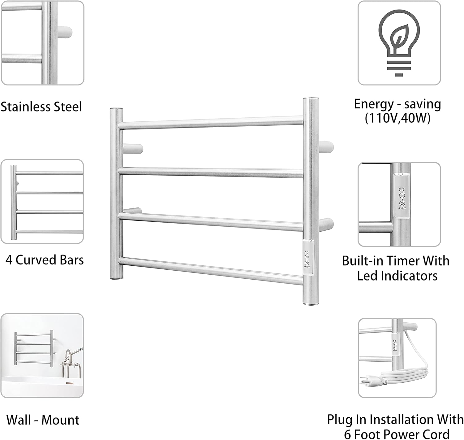 - Premium Quality with Elegant Look: The bath towel warmer is made of durable 304 stainless steel, easy to clean and durable use. IP56 Waterproof standard and wall-mounted design maximizes your floor space.