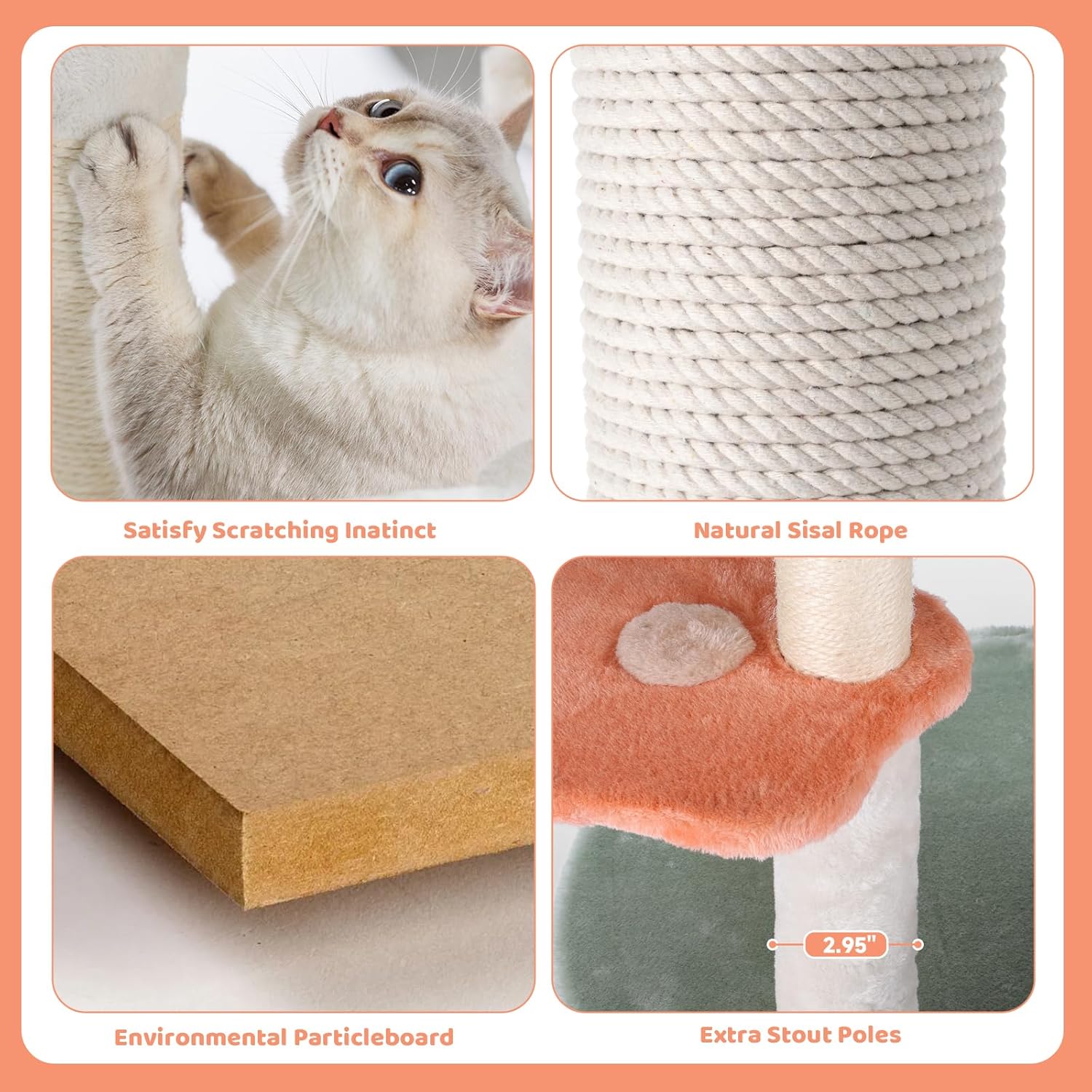 - Premium Materials:Made with CARB-certified P2 particleboard and 400g soft plush for comfort. Features 9-core 6mm sisal scratching posts, more durable than regular sisal, to satisfy your cat's scratching instincts and protect your furniture.