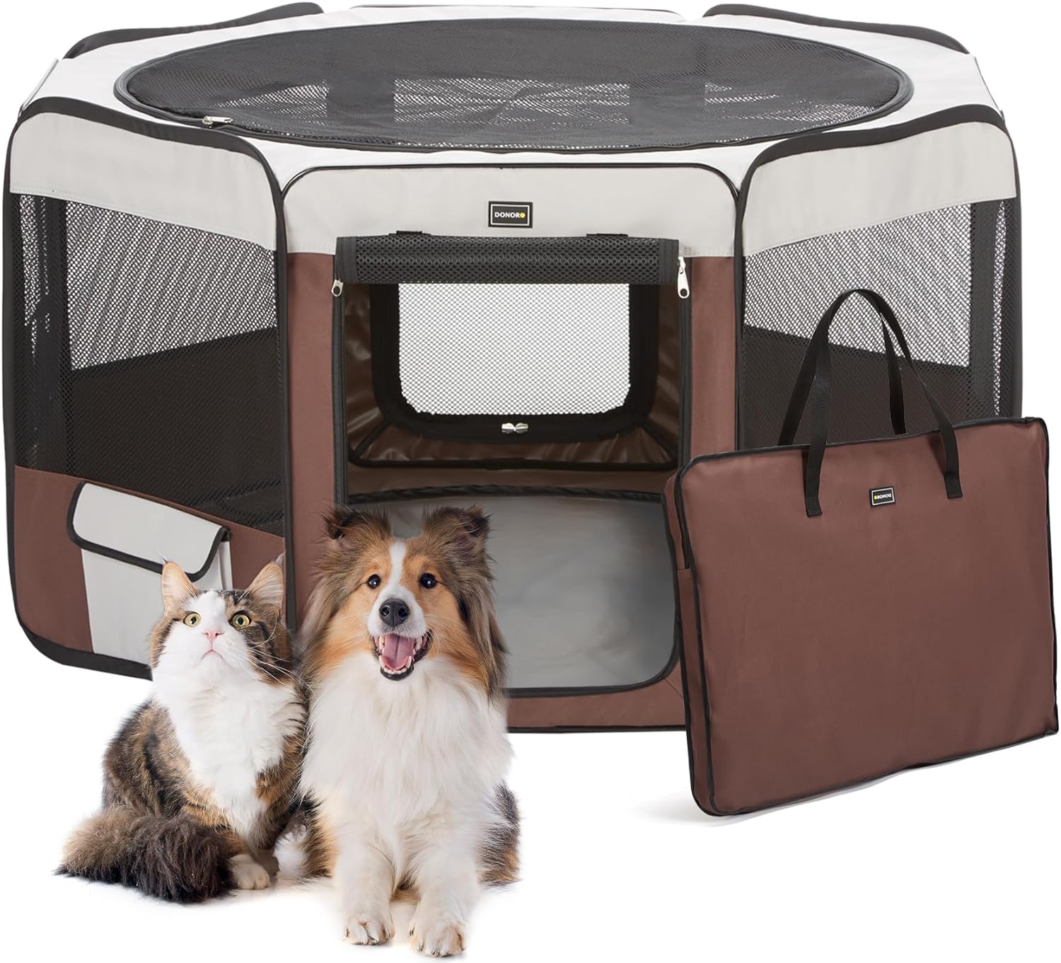 DONORO Dog Playpen Portable Pet Play Pens for Small Dog/Cat/Rabbit/Chicks, Cat Playpen Indoor/Outdoor with Carring Case, Removable Zipper Top and Bottom (Brown, Small (28"x28"x14"), 8)