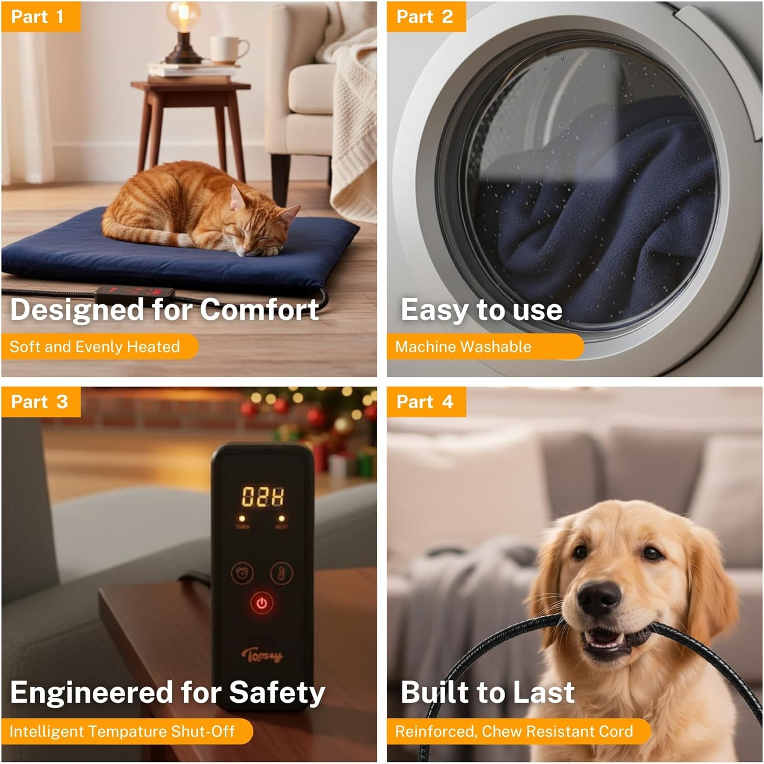 Toozey Large Pet Heating Pad, 6 Adjustable Temperature Dog Cat Heating Pad with Timer, Waterproof Heated Dog Bed with Chew Resistant Cord, Indoor Electric Pet Heated Mat 35x24in