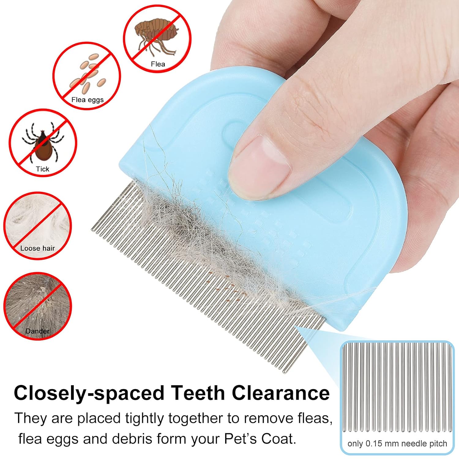 - [DURABLE AND EFFECTIVE] The long and short tooth comb penetrates the undercoat without harming your pet, easily removes mats,tangles, and prevents painful matting. The high-strength enclosed stainless steel fine-tooth comb for dogs and cats, only 0.15 mm needle pitch can help you identify any pests on your pet and effectively clear away these pests and other fragments (e.g. filth, debris and dust) effectively.
