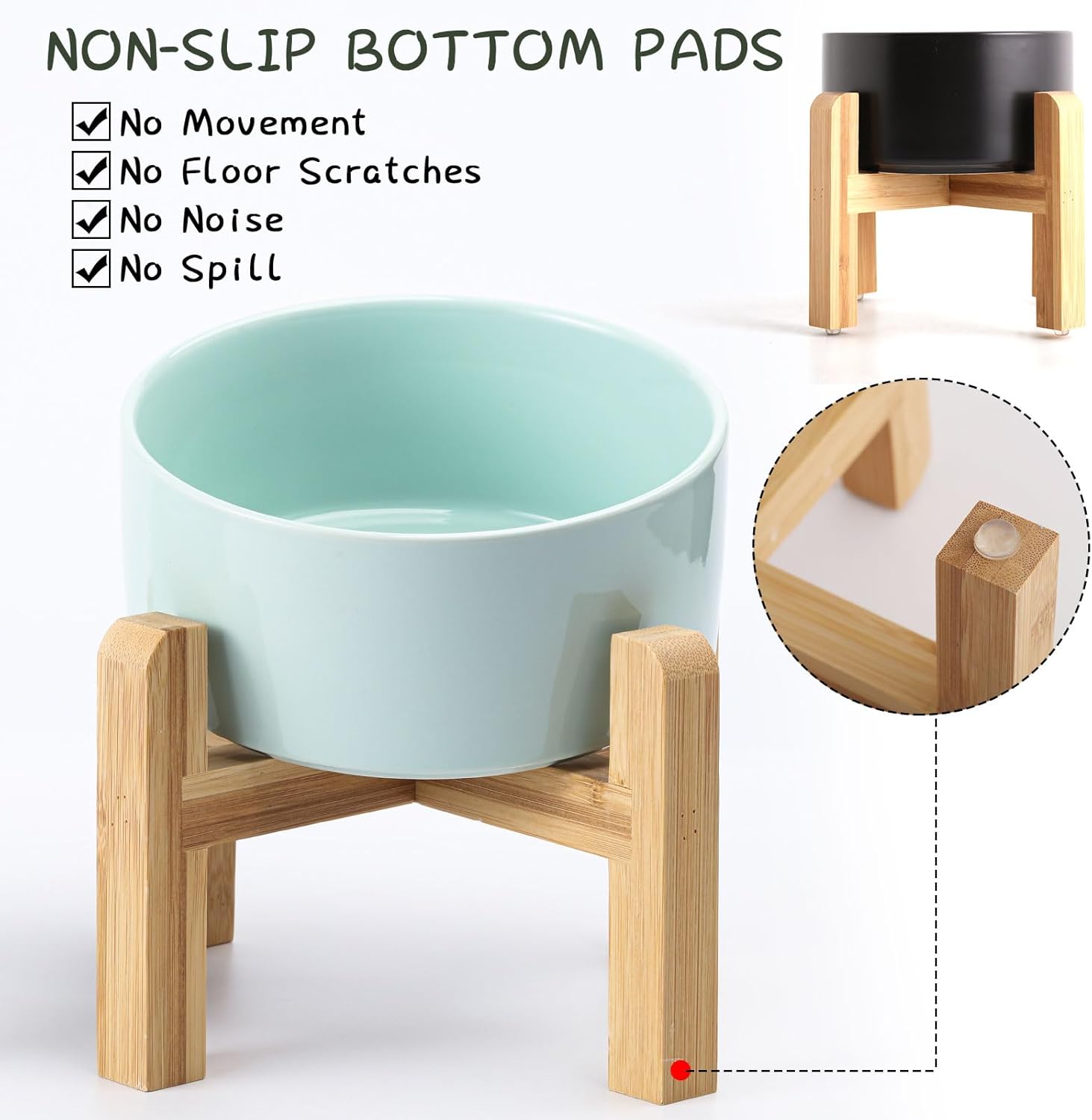 - NON SLIP WOOD STAND -You can get two different heights by flipping the bamboo stand,the elevated cat bowls are perfect for cats and small size dogs from different stages of childhood to adulthood, The wood stand on the bowls stopping ceramic cat dog bowl from sliding around, Keeps pet food and water in the bowls.
