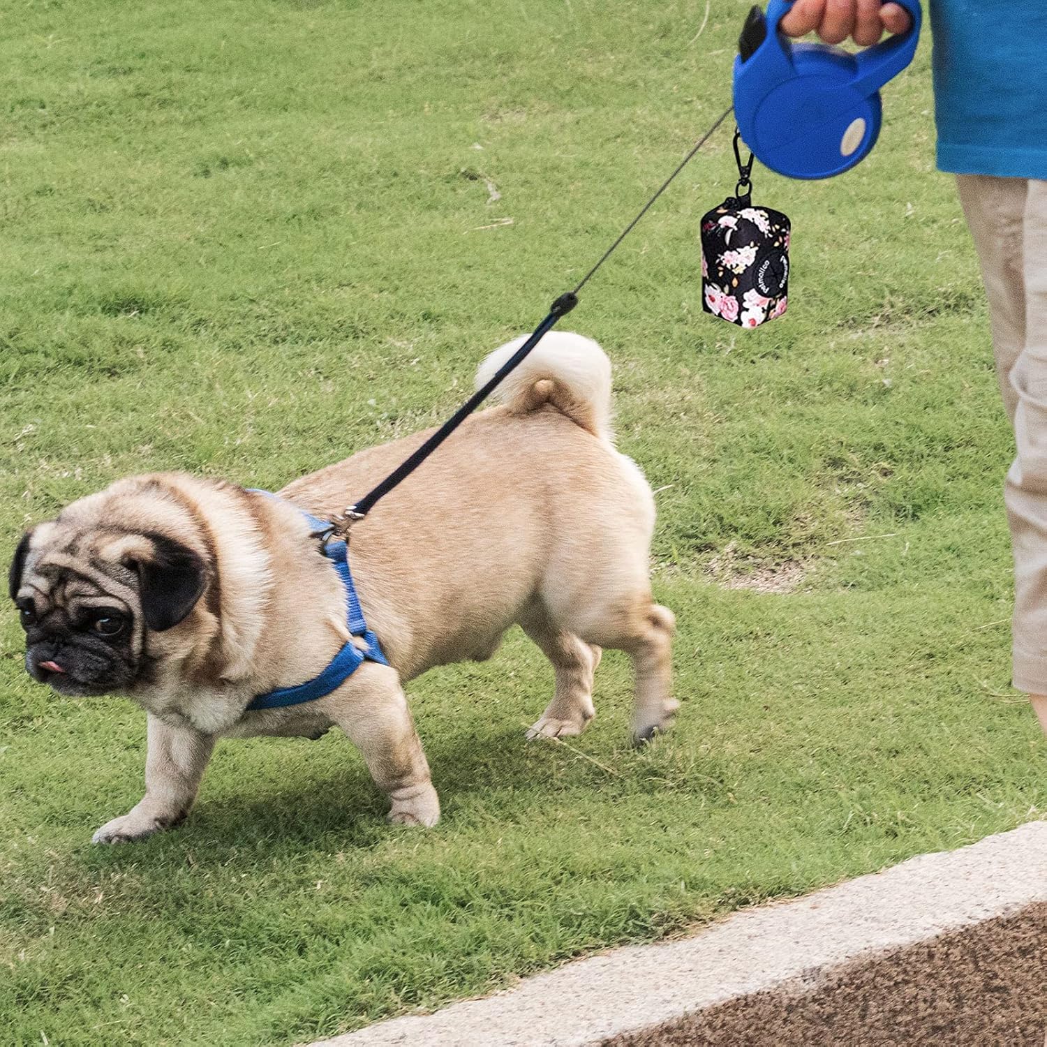 - The lightweight dog poop bag dispenser easily secures flat to any dog leash or use the metal button to attach it onto your dogs collar or harness.