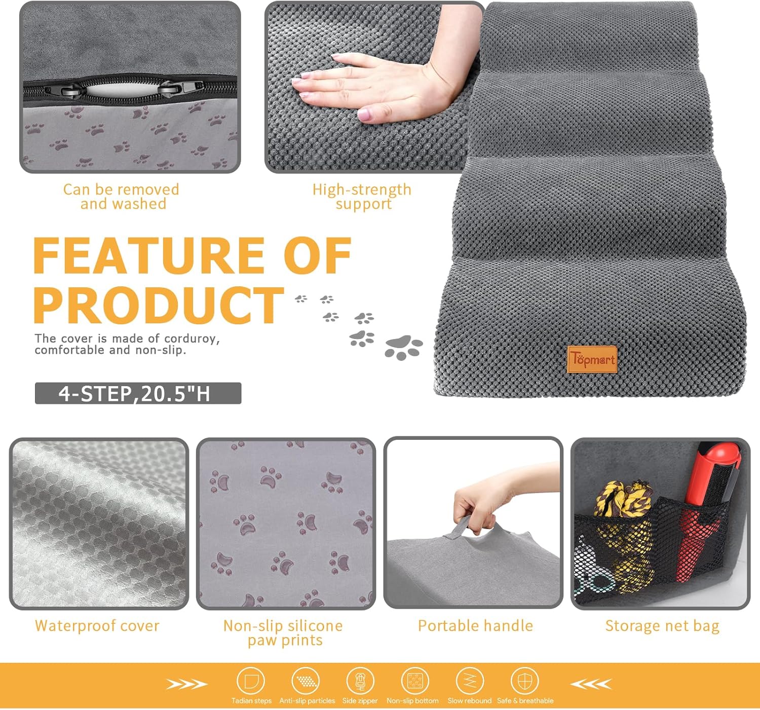 - Safer,Wider&Deeper Steps:Each step is 15.75in x 7.1in.Our dog stairs are excellent for those older dogs who are less mobile as they age or for cats with injuries. More wide and deep steps are helpful for reducing the strain that constantly jumping up and down onto bed,sofa or car can have on your pet's joints,and Topmart dog steps will not shake and slip during use. The cover made of corduroy is more frictional than other covers, pets will not slip on the stairs.