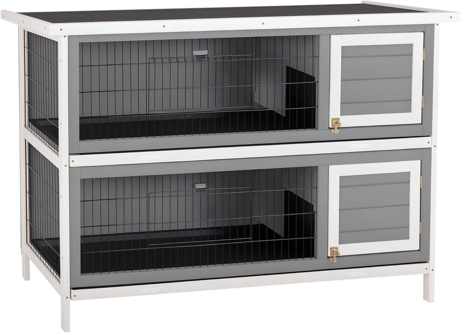 PawHut 54" 2-Story Large Rabbit Hutch Bunny Cage Wooden Pet House Small Animal Habitat with Lockable Doors, No Leak Tray and Waterproof Roof for Outdoor/Indoor Dark Grey