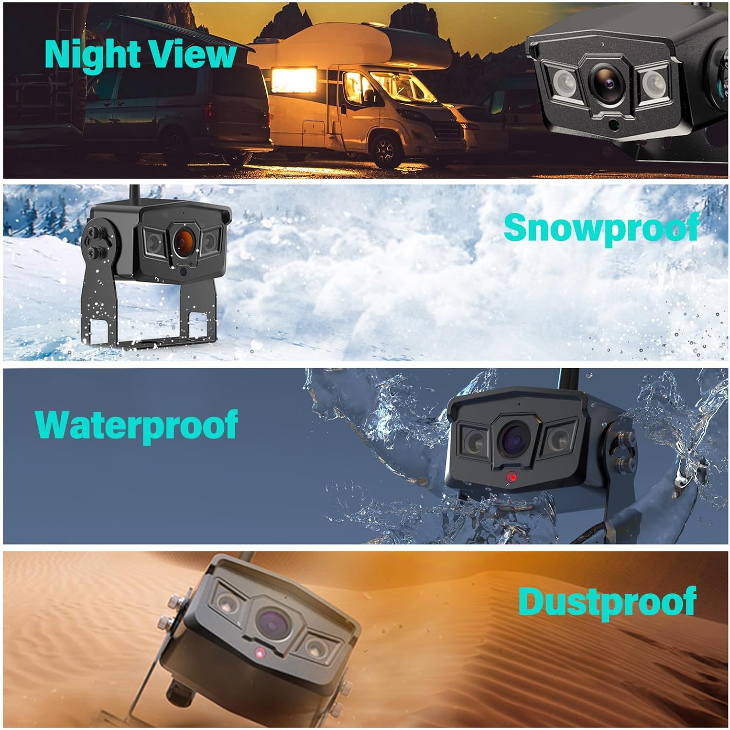 - 🚚🚚 Long Signal Transmission Distance - This trailer backup camera wireless with monitor is suitable for Cars, RV, Truck, Semi-Trailer, Pickups, Camper, Van, 5th wheel, Motorhome. The signal can reach over 300ft in open area, and 50ft on vehicle for reversing or 36ft on vehicle for continuously use. With IP69K waterproof standard, the wireless backup camera rv can work in extreme weather from -4℉~176℉. No lens water or fog issues.