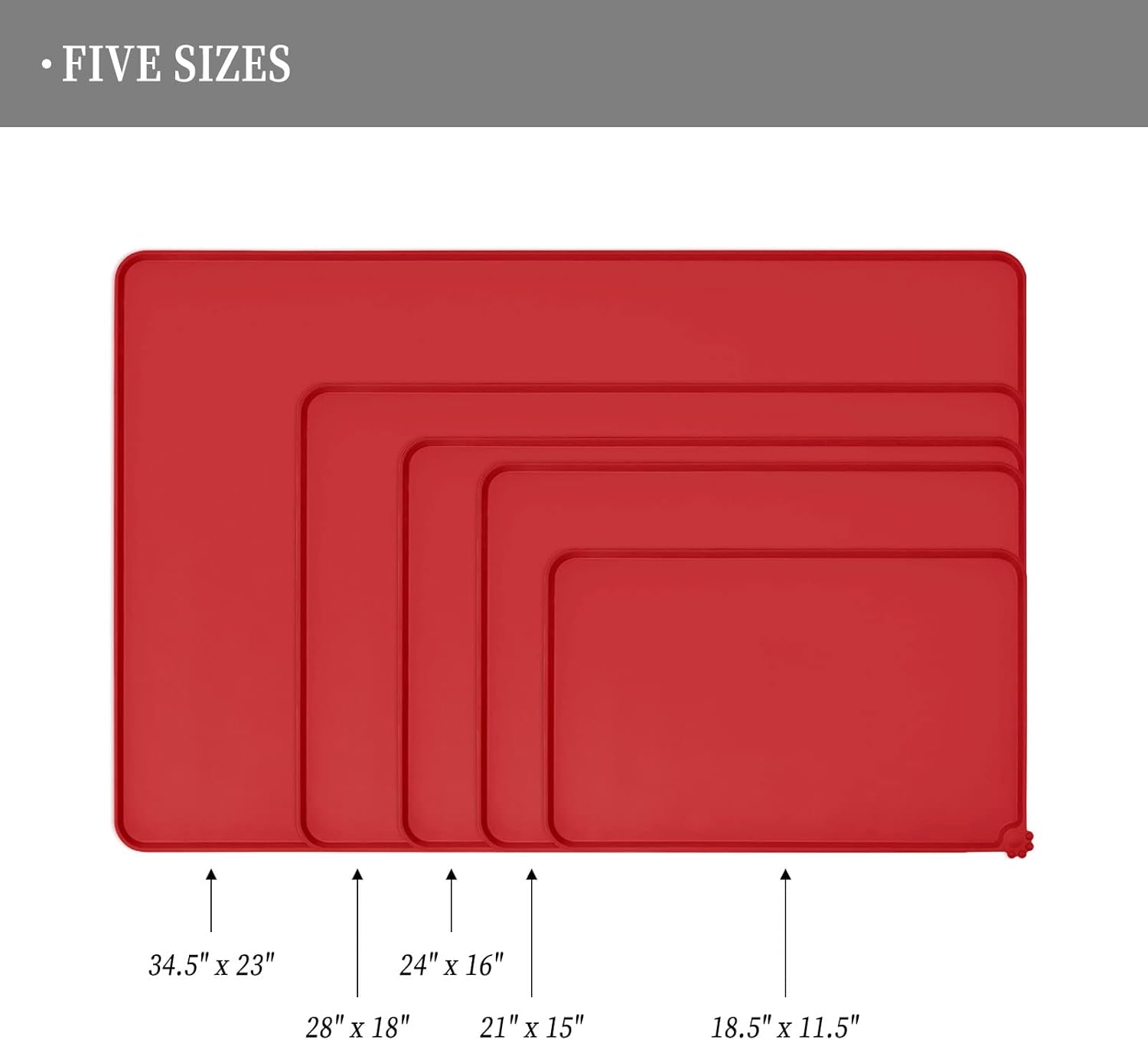 - Various sizes available: our pet mats come in 5 different sizes - 18.5" x 11.5", 22" x 14", 24" x 16", 28" x 18", and 32" x 24". Suitable for all kinds of pets, from puppies to large pets, choose the perfect size for your furry friends and avoid messy spills at mealtime