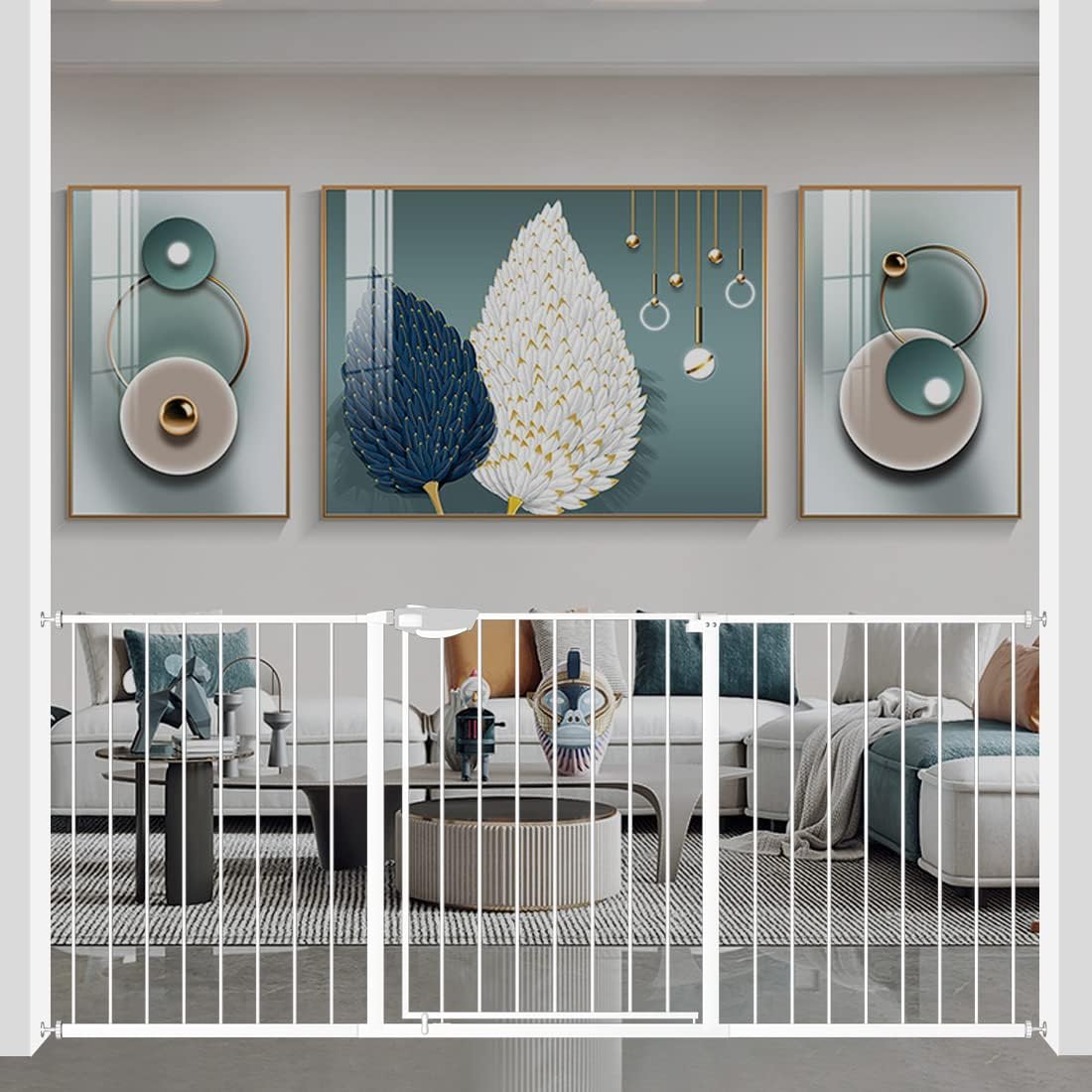- 【Multi Use】The width of the triple lock extra wide pressure mounted baby gate can be adjusted from 25.59 inches to 81.49 inches so that it is available for stairs, doorways, and other diverse occasions to stop babies or pets to climb over. Tips: before installation, there will be a gap between the wide gate latch and the frame which is NOT a defect and it is NOT bent. This gap will disappear once installed.