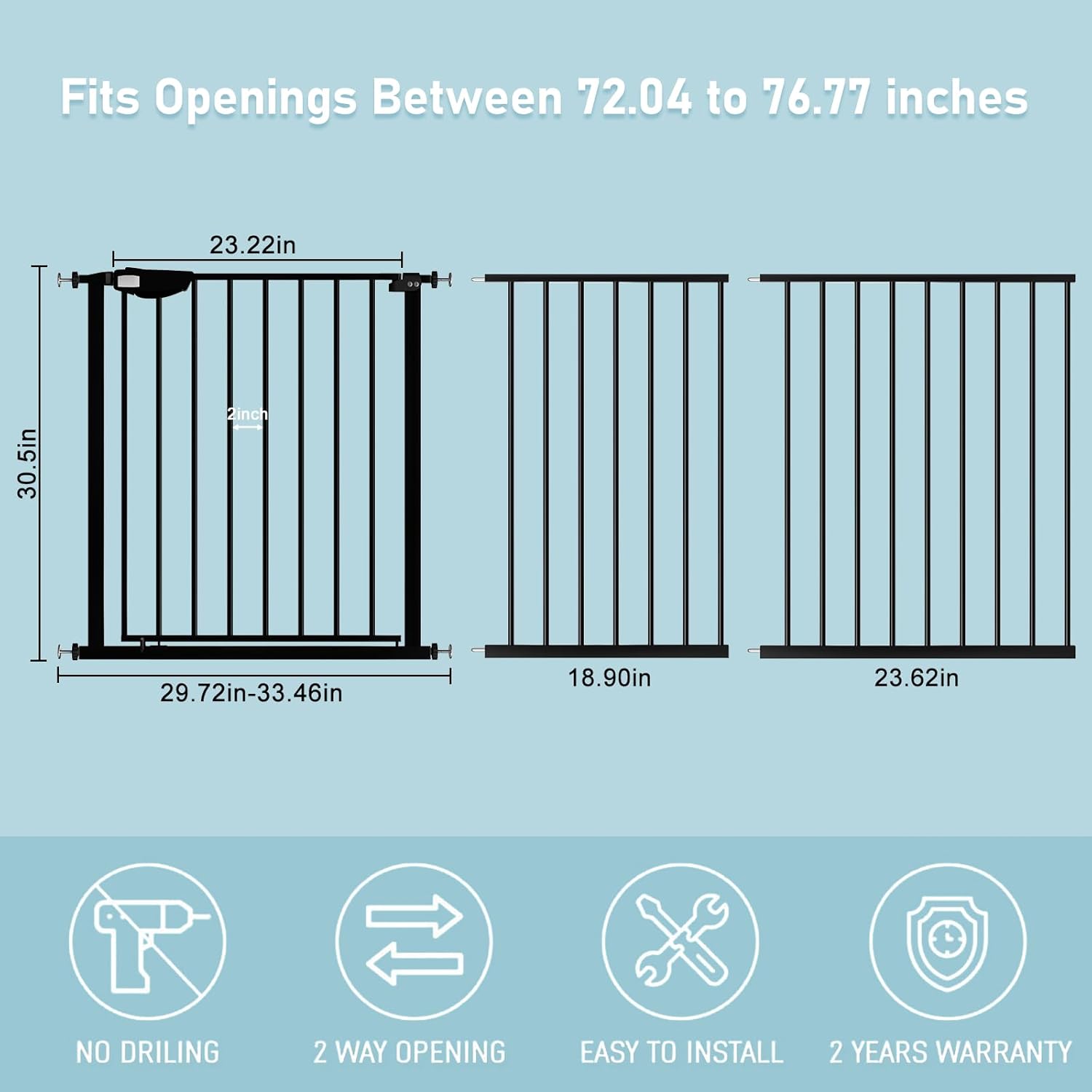 - 【Multi Use】The width of the triple lock extra wide pressure mounted baby gate can be adjusted from 25.59 inches to 81.49 inches so that it is available for stairs, doorways, and other diverse occasions to stop babies or pets to climb over. Tips: before installation, there will be a gap between the wide gate latch and the frame which is NOT a defect and it is NOT bent. This gap will disappear once installed.