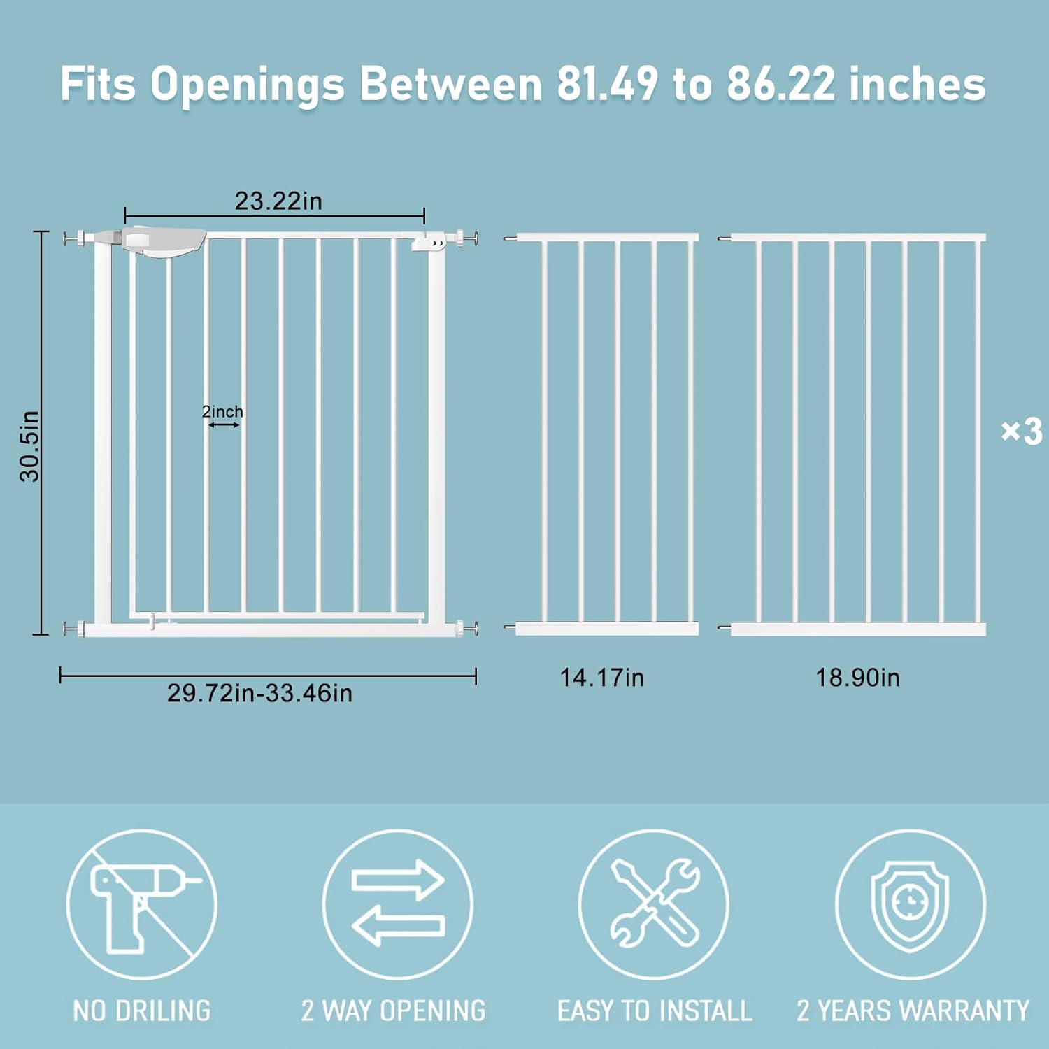 WAOWAO Triple Lock Baby Gate Extra Wide 81.49-85.82" Pressure Mounted Walk Through Swing Auto Close Safety White Metal Dog Pet Puppy Cat for Stairs,Doorways,Kitchen