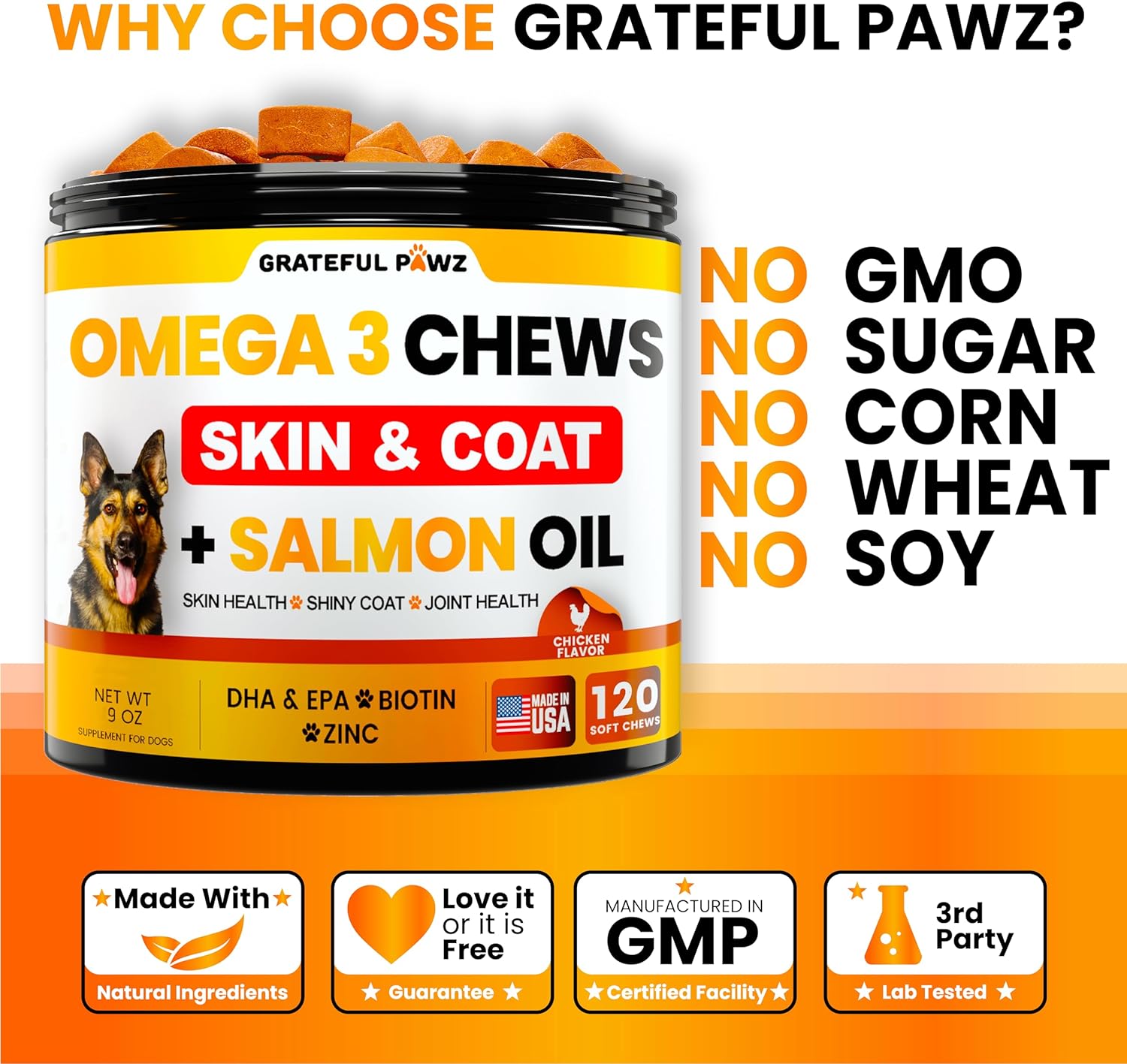 Omega 3 for Dogs - Fish Oil for Dogs Chews - Allergy and Itch Relief - Anti Shedding Supplement - Joint Health Treatment - Dry Itchy Skin and Coat Supplement - Salmon Oil - EPA & DHA - Made in USA