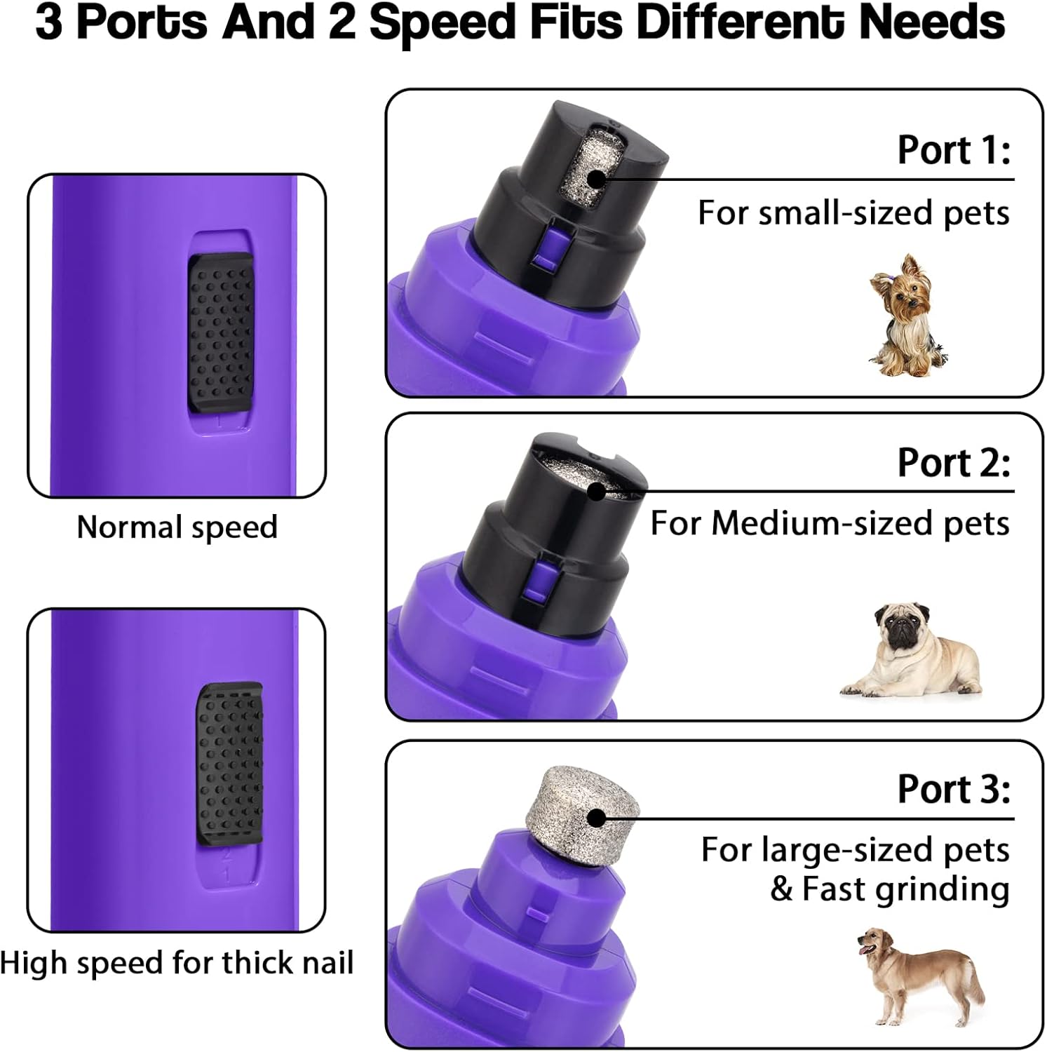 - Advanced 2-Speed Switch & 3 Grinding Ports: The trimmer features an adjustable, low-high speed design powerful enough support heavy grinding. And with 3 ports to match small, medium, or large pets, simply choose the appropriate port and speed depending on your pet's size and nail hardness.