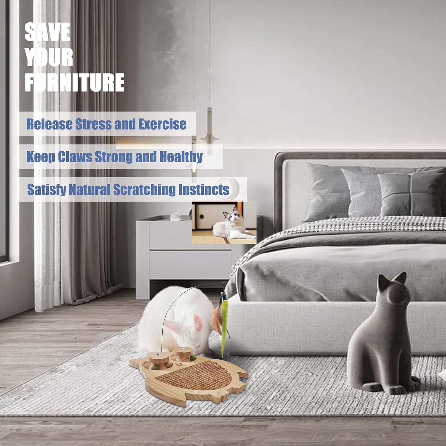 - Protection of Furniture - The cat scratcher Toy is woven sisal to sharpen claws. Cat scratch it instead of your sofa, rug, carpet and other furniture. Can effectively protect furniture and satisfy your cat's natural scratching instincts and keep your cat claws strong and healthy.