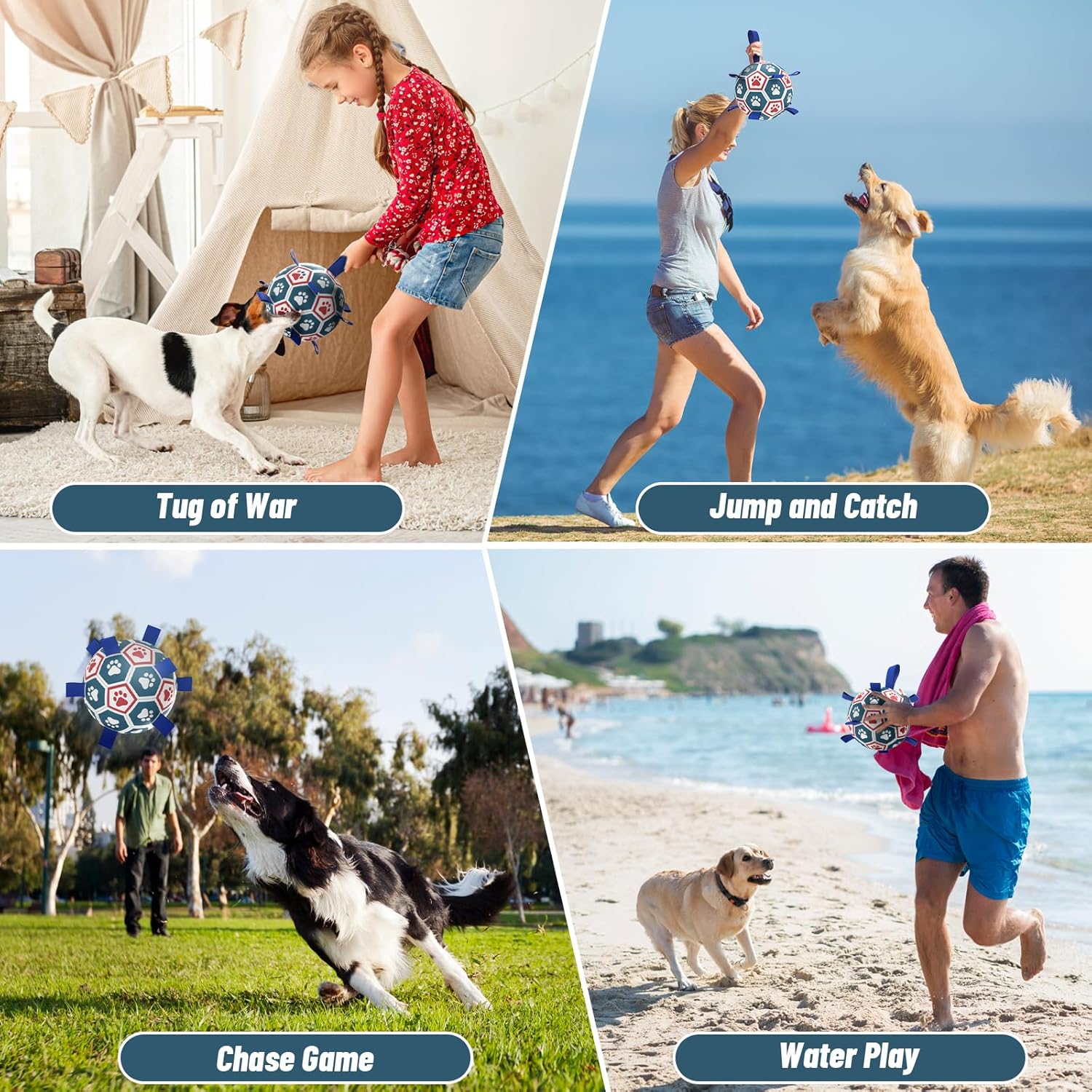 - Lightweight Dog Water Toys: Adopted the lightweight, buoyant design, QDAN soccer ball for dogs can be played inthe poal, lake and beach as well, The straps of a dog soccer ball is meant to keep your dog entertained, active andhelp human beings and dogs stay engaged