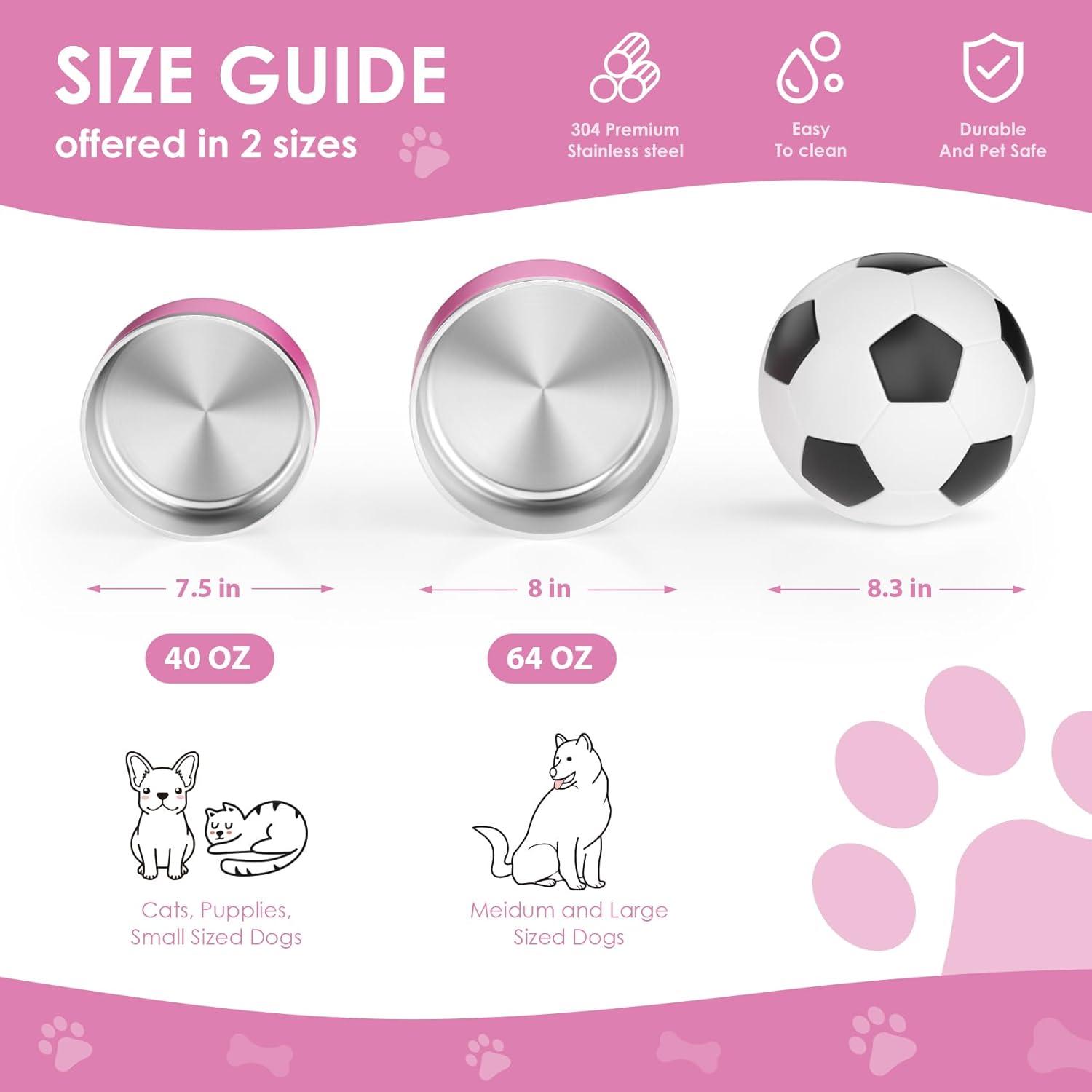 IKITCHEN Dog Bowl for Food and Water, 40 Oz Stainless Steel Pet Feeding Bowl, Durable Non-Skid Double Wall Insulated Heavy Duty with Rubber Bottom for Medium Large Dogs (40 Ounces/5 Cup, Pink)