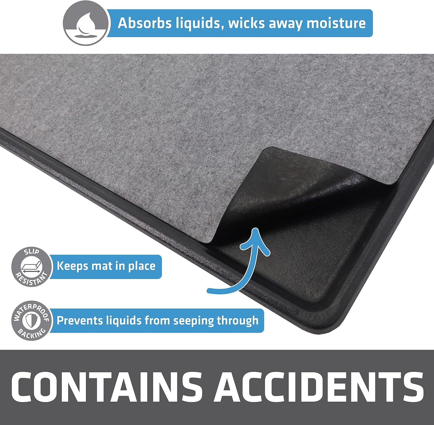- ABSORBENT POLYESTER FABRIC, WITH WATERPROOF BACKING (SLIP-RESISTANT): Zorb-tech Anti Flow technology quickly absorbs liquids and wicks away moisture. Features a waterproof & slip-resistant backing that prevents liquids from soaking through to the surface below and keeps the mat securely in place.