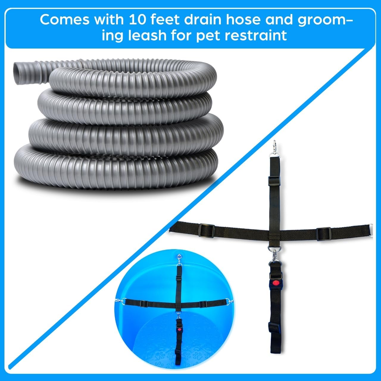 - Comes with 10 feet drain hose and grooming leash for pet restraint