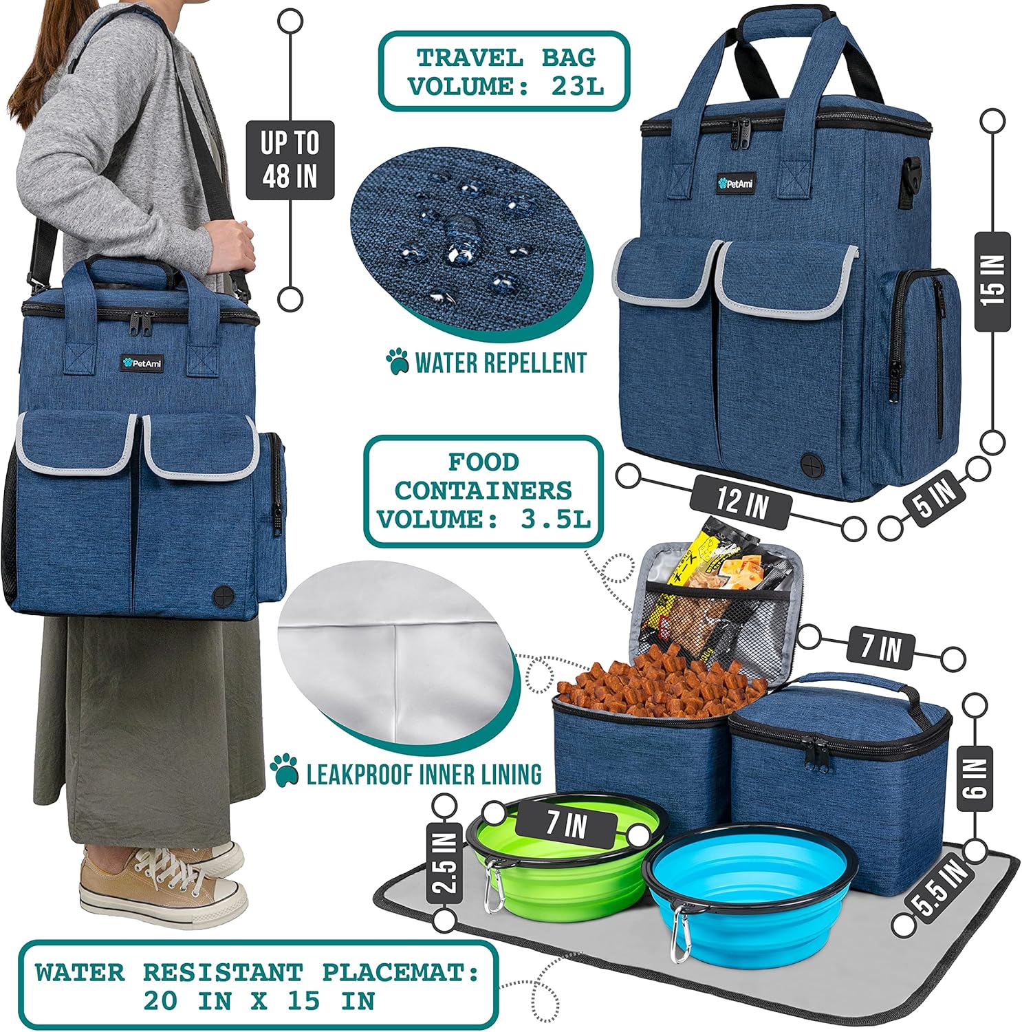 - AIRLINE APPROVED DOG BAGS FOR TRAVELING: 1 dog tote bag, 2 pet food containers, 2 pet silicone collapsible bowls & 1 water-resistant placemat for feeding makes easy clean up after meals. Each waterproof dog food container has a 3L capacity and is suitable for small, medium, and large dogs. Travel tote bag includes a poop bag dispenser, adjustable shoulder strap, and sturdy handles to easily transport for any trip.