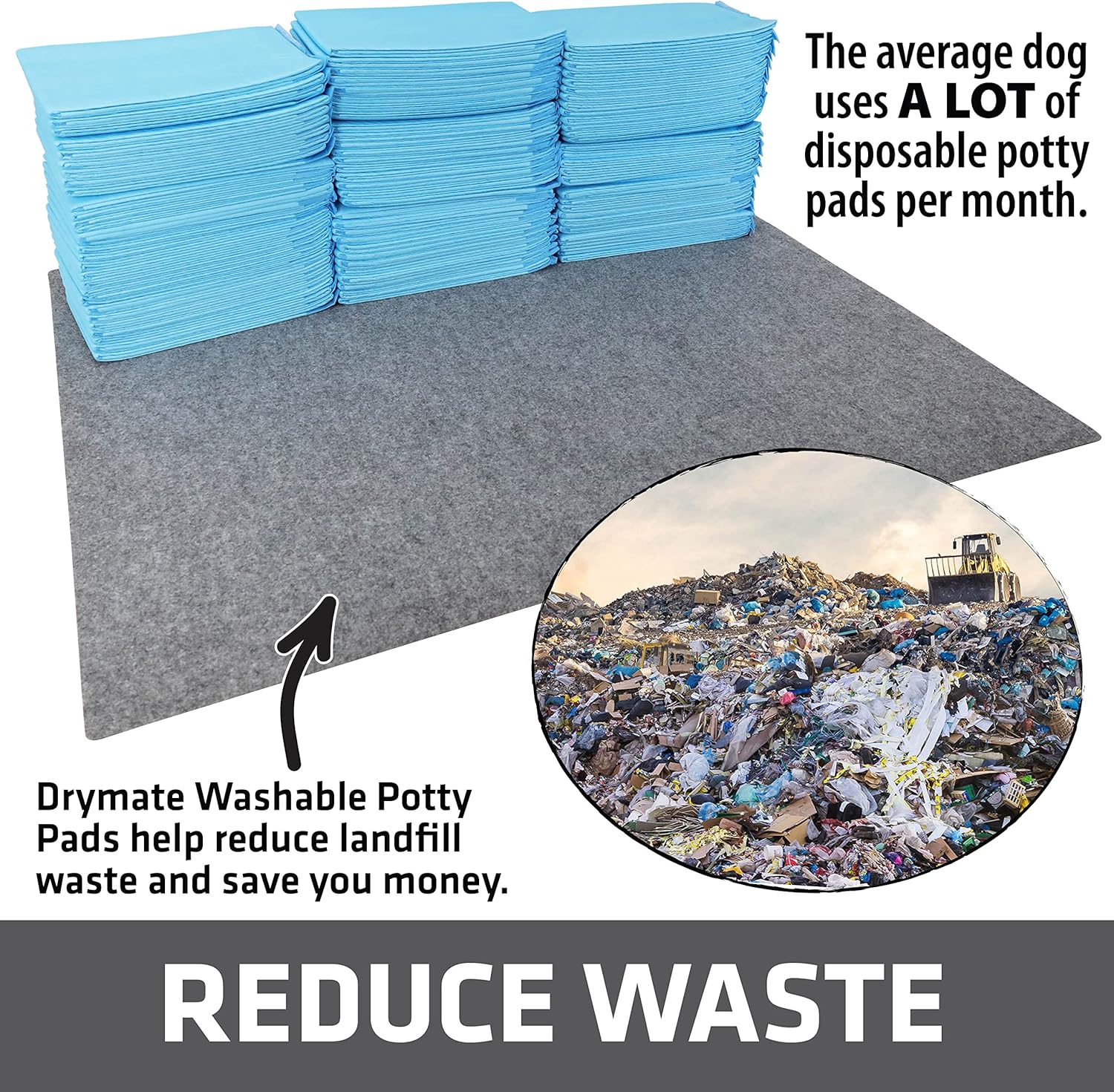 - HELP REDUCE LANDFILL WASTE & SAVE MONEY: Drymate Washable & Reusable Potty Pads provide an environmentally-friendly solution for dog potty training by eliminating the need for disposable pads, helping to reduce landfill waste and save you $$$. CONTAINS ACCIDENTS & PROTECTS SURFACES: Our potty pads quickly absorb urine and protect floors from potty training accidents in and around the home.