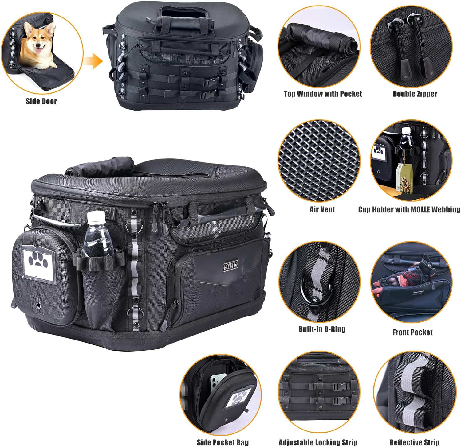 - ✅A MOTORCYCLE PET CARRIER, A MOTORCYCLE STORAGE BAG:✅ The motorcycle pet carrier crate overall size: 20" L x 13" W x 15" H.Our motorcycle pet dog carrier is the perfect way to take your small pet on your bike. Plus, when you are not using it as a pet carrier,it can also be used as a storage cargo bag.With 3 zipper different size pockets to maximize storage space for gloves,phones,tools,etc, while it also bulit-in independent cup holder and MOLLE webbing to hang treats or keys.