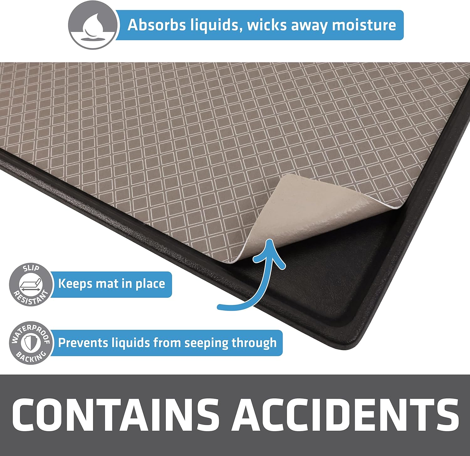 - ABSORBENT POLYESTER FABRIC, WITH WATERPROOF BACKING (SLIP-RESISTANT): Zorb-tech Anti Flow technology quickly absorbs liquids and wicks away moisture. Features a waterproof & slip-resistant backing that prevents liquids from soaking through to the surface below and keeps the mat securely in place.