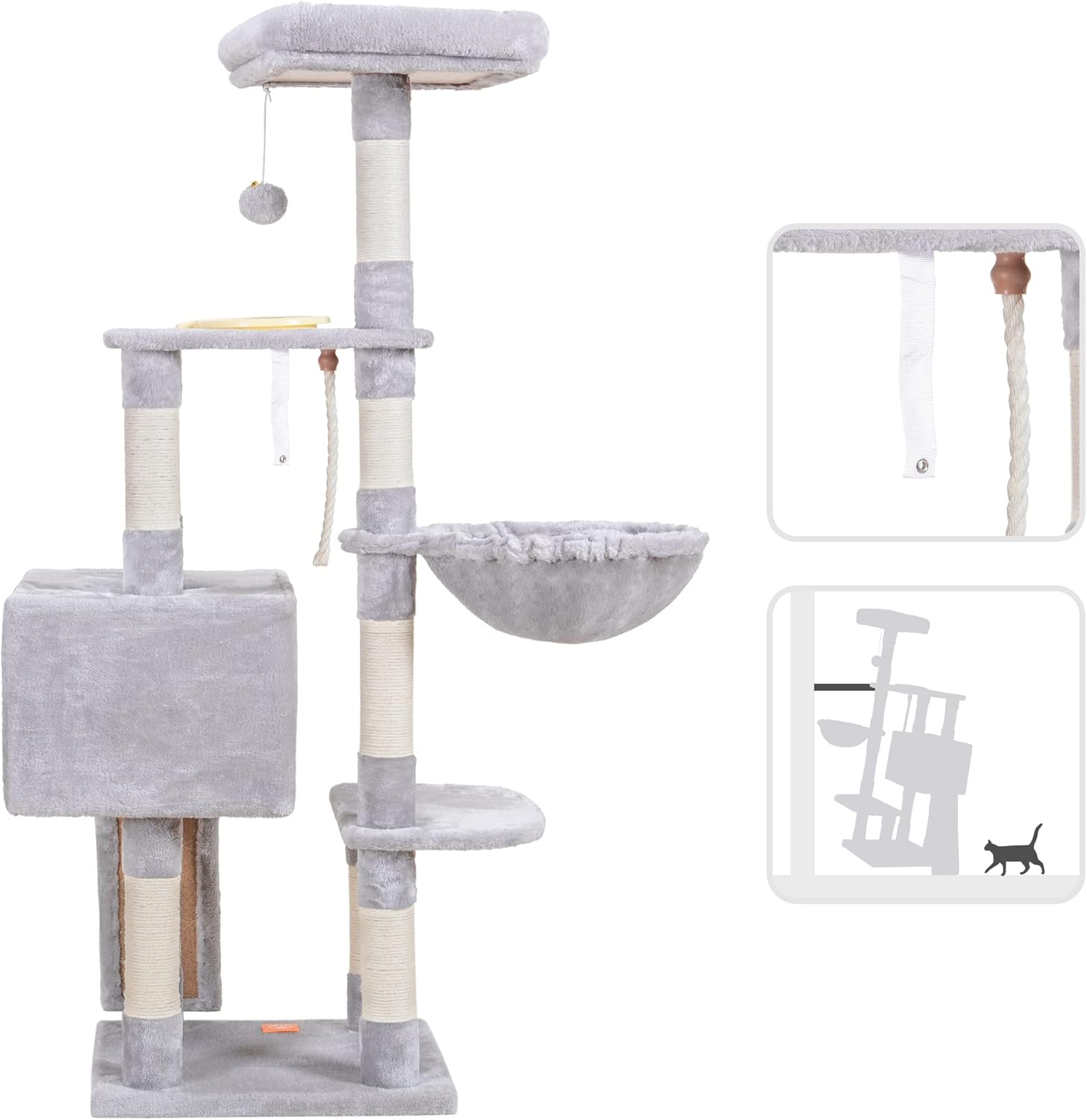 Heybly Cat Tree, Cat Tower for Indoor Cats with Scratching Board, Multi-Level Cat Furniture Condo with Feeding Bowl, Light Gray HCT010MW