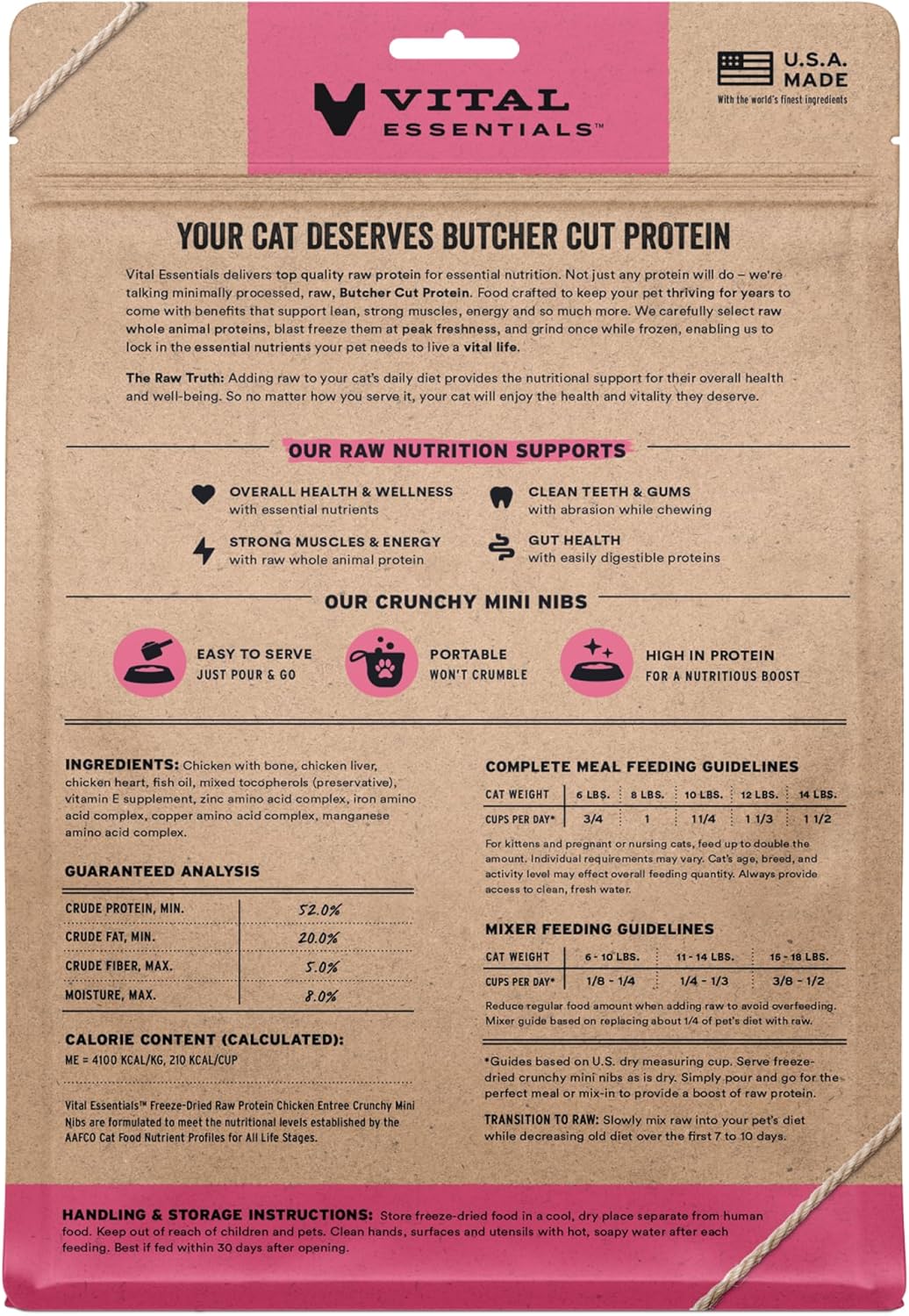 - CRUNCHY FREEZE-DRIED RAW CHICKEN CAT FOOD: Vital Essentials Crunchy Freeze Dried Cat Food packs more protein than industry standard into every bite to deliver the peak vitality your cat deserves, especially when compared to dehydrated cat food. This complete and balanced freeze-dried raw cat food is made with premium butcher cut chicken, responsibly sourced in the USA.