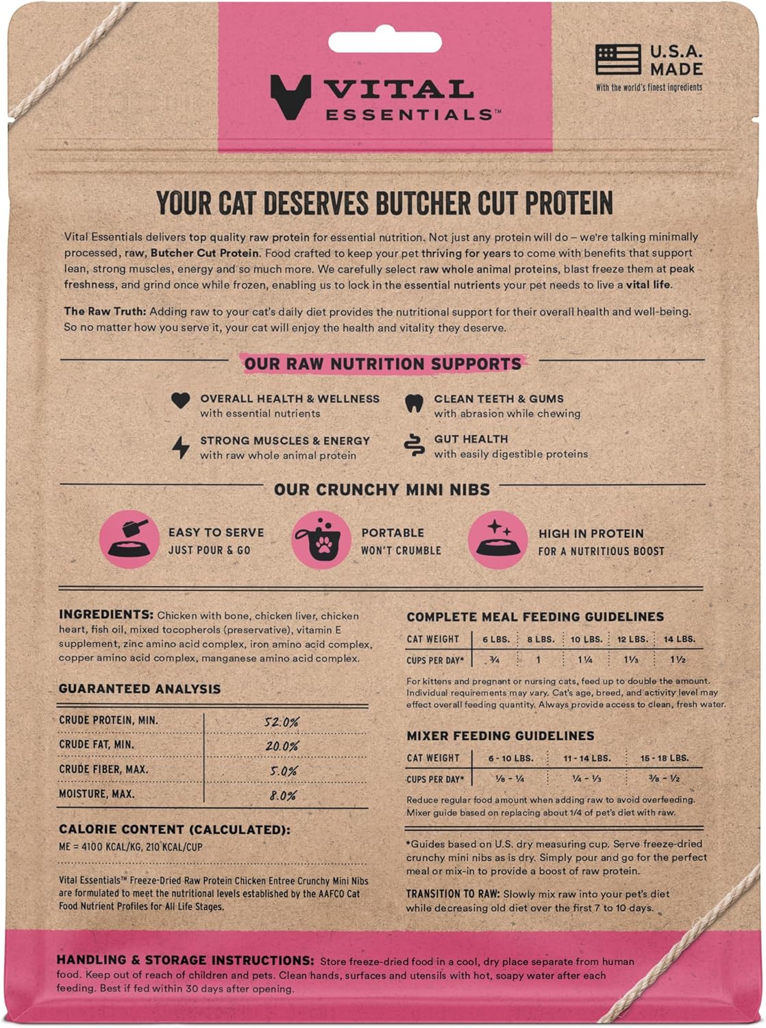- CRUNCHY FREEZE-DRIED RAW CHICKEN CAT FOOD: Vital Essentials Crunchy Freeze Dried Cat Food packs more protein than industry standard into every bite to deliver the peak vitality your cat deserves, especially when compared to dehydrated cat food. This complete and balanced freeze-dried raw cat food is made with premium butcher cut chicken, responsibly sourced in the USA.