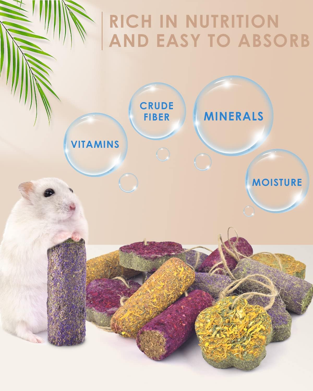 - Natural Molar Snacks: Rabbit chews are made of high quality timothy hay, carrot and strawberry, without any added pigment material, glue,additives. They are rich in plant fiber and nutrients that help pets improve digestion, increase their appetite, which ensure the health of small animals growing up