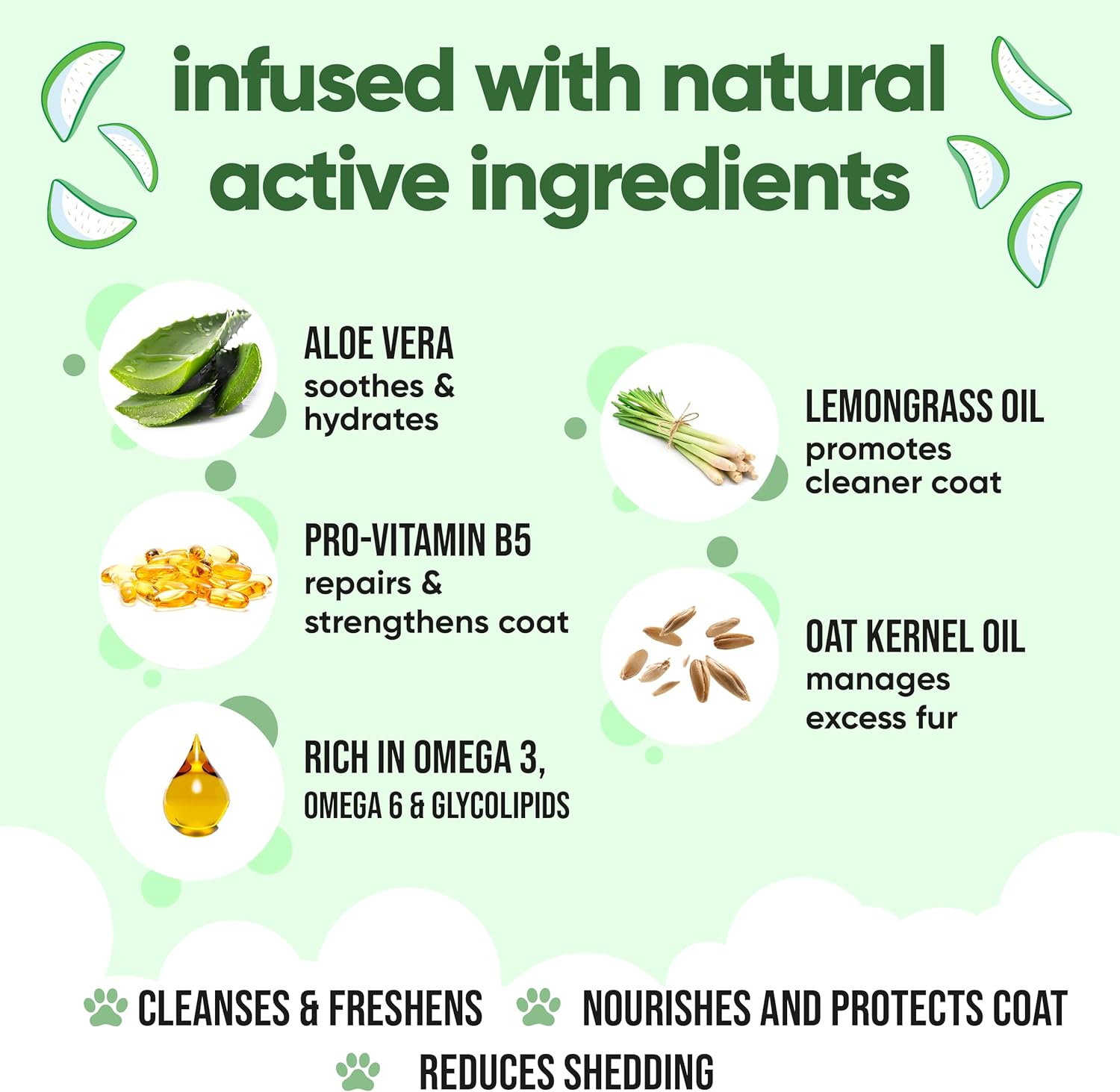 - Product Benefits : Helps minimize shedding, promotes healthy skin, and nourishes the coat with a blend of omega 3 & 6, glycolipids, aloe vera, lemongrass, and pro-vitamin B5. Helps minimize shedding, promotes healthy skin, and nourishes the coat with a blend of omega 3 & 6, glyco… See more