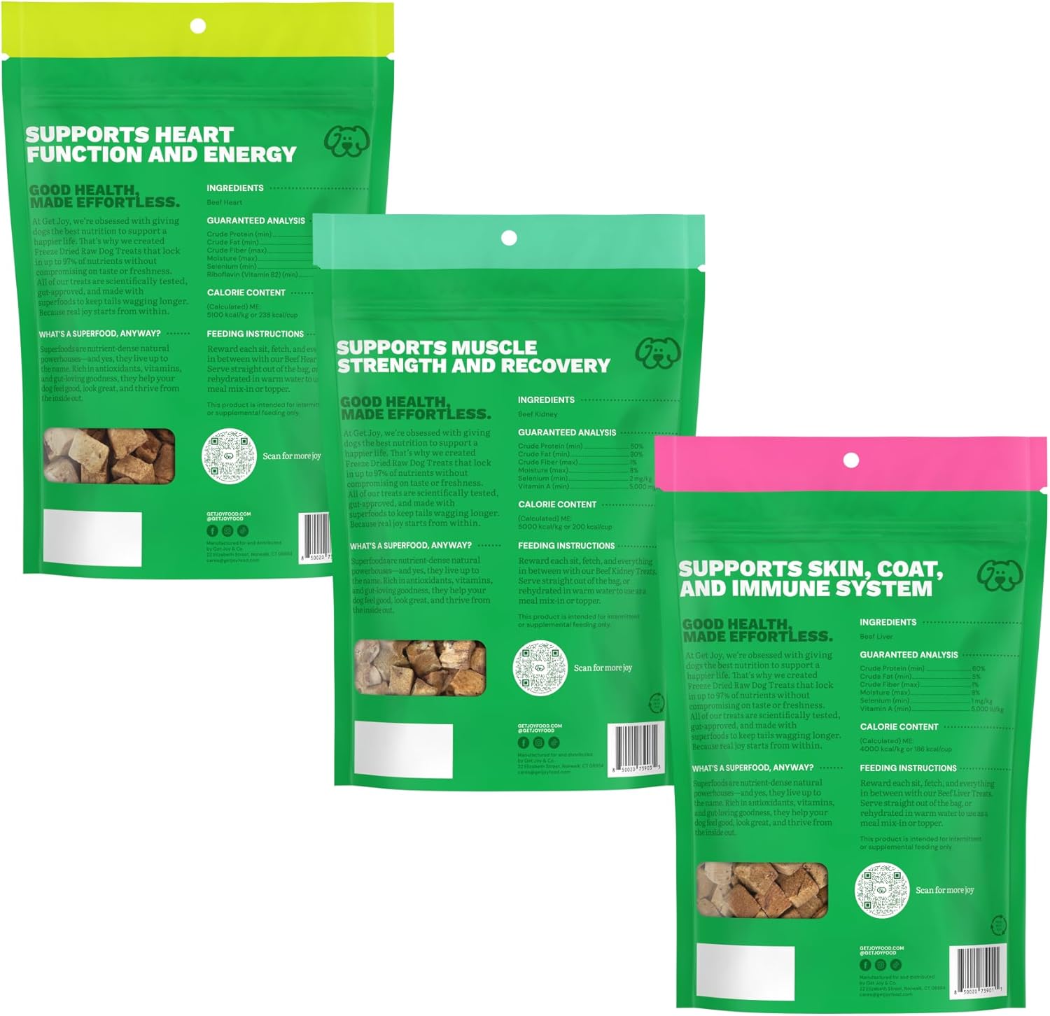 - Contains: (3) 4- Ounce Resealable Bags of Get Joy Freeze Dried Superfood 100% Beef Organ Dog Treats (1- Beef Hearts, 1- Beef Kidney, 1- Beef Liver). Freeze dried to lock in 97% of nutrients from raw, fresh ingredients, while preserving shelf life